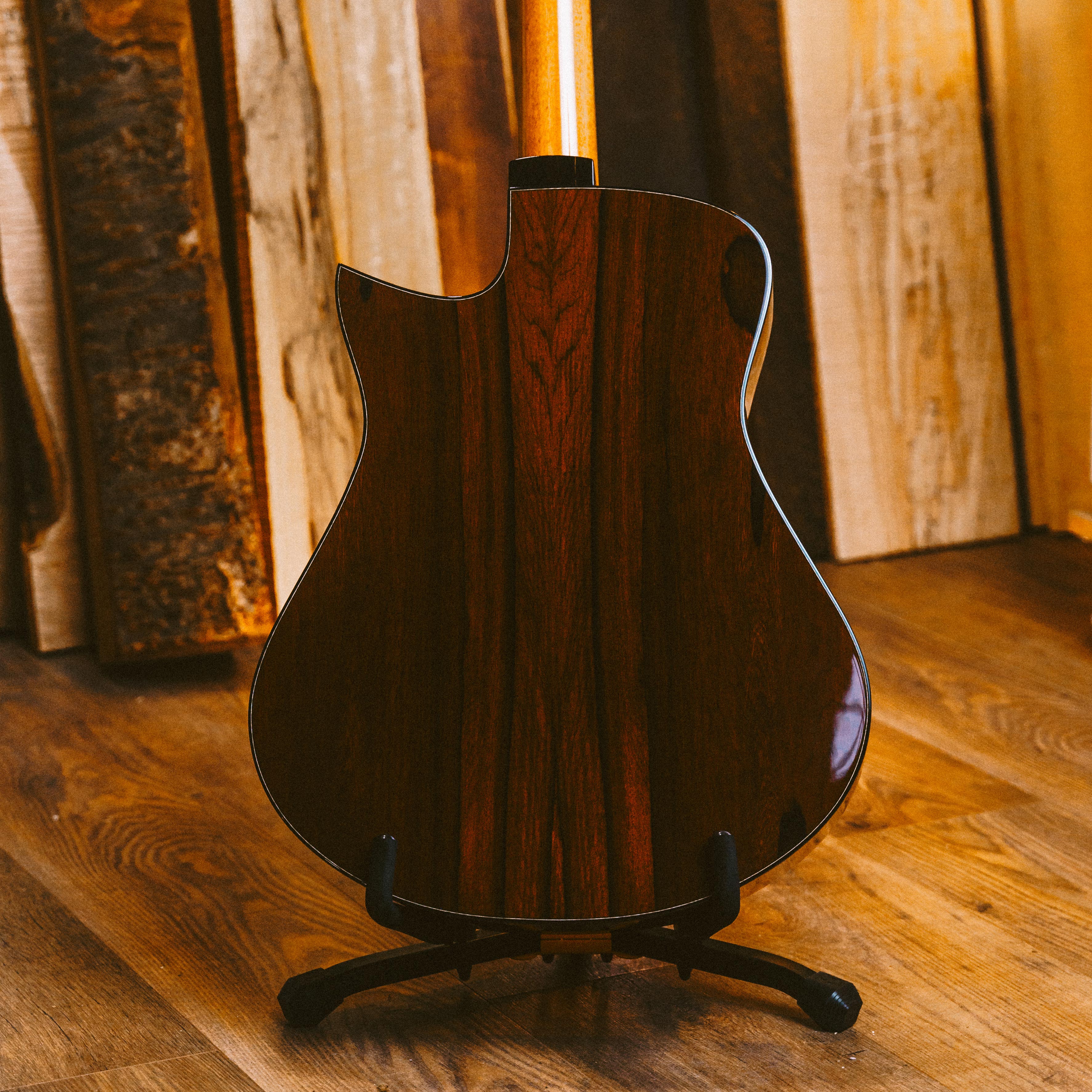 nombreux constructeurs et joueurs jurent qu’il n’y a pas de substitut à l’authentique bois de rose brésilien : le ton dynamique, le bourdonnement durable et le look unique sont tout simplement inégalés. C’est une grande partie de ce qui a fait des Martins d’avant-guerre et des Golden Era Gibsons les guitares les plus prisées de tous les temps. Mais avec la restriction de l’exploitation forestière commerciale dans la réglementation 1960 et CITES dans la réglementation 1990s, il a été presque impossible de récolter, d’exporter ou d’importer à l’international, ce qui a considérablement augmenté les coûts...