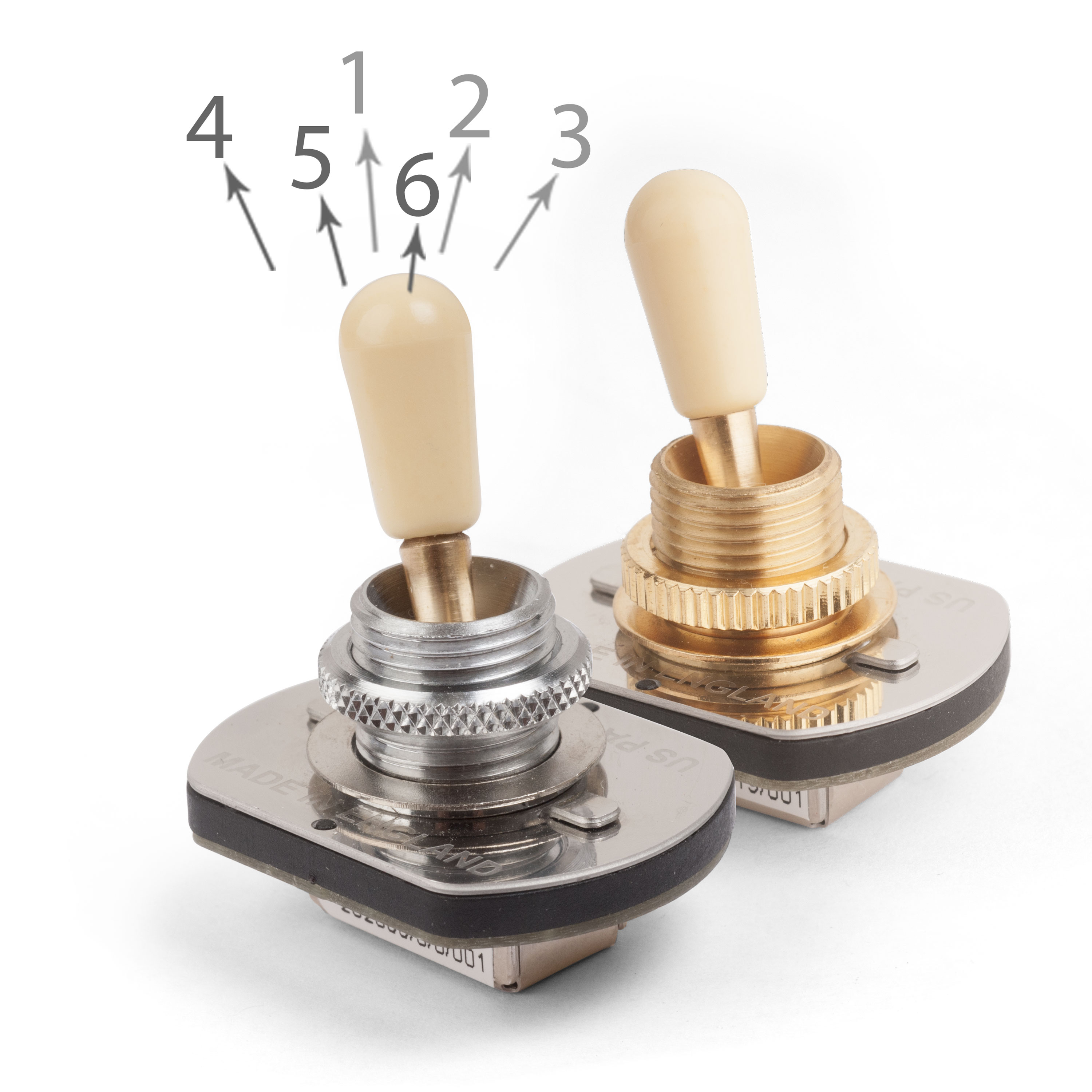 6 positions levier de vitesse guitare ! Il fait le travail de plusieurs commutateurs standard : l'action de bascule transversale à 2 pôles et 6 positions élargit les options de câblage et les possibilités de tonalité. Idéal pour la séparation des bobines, la sélection de 3 pickup , l’activation de la pickup piézoélectrique et la commutation humbucker/une bobine/humbucker.Avec