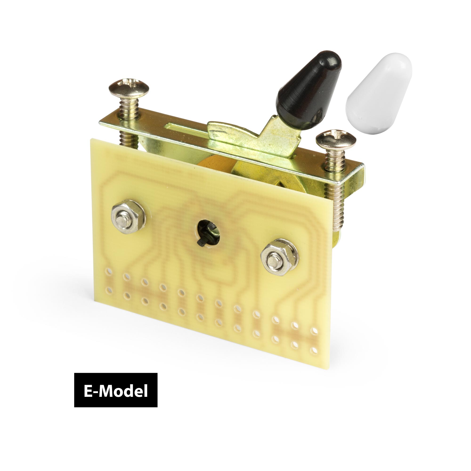 Le E-Model Megaswitch permet des configurations de câblage impossibles avec un commutateur standard à 5 positions, notamment le coil-tapping et les connexions spéciales d'annulation du bourdonnement. Les cosses 12 offrent deux fois plus d'options de câblage que les versions précédentes à 6 cosses. Utilisez ces cosses supplémentaires pour d’autres combinaisons de réglage de la tonalité ou de capteur. Des schémas de câblage complets et faciles à suivre sont inclus.