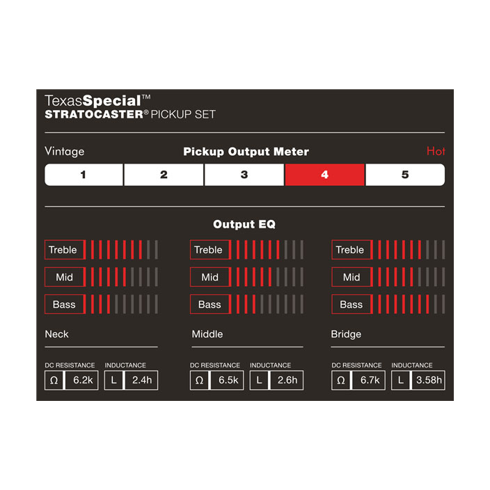 Comme on l’entend sur les guitares Fender American Special Stratocaster et caractérisées par leur son moyen de gamme, leurs aigus cristallins et leurs basses serrées, les pick-up Fender Texas Special Strat sont dotés d’une construction à bobine unique enroulée qui produit un ton bleu Texas.