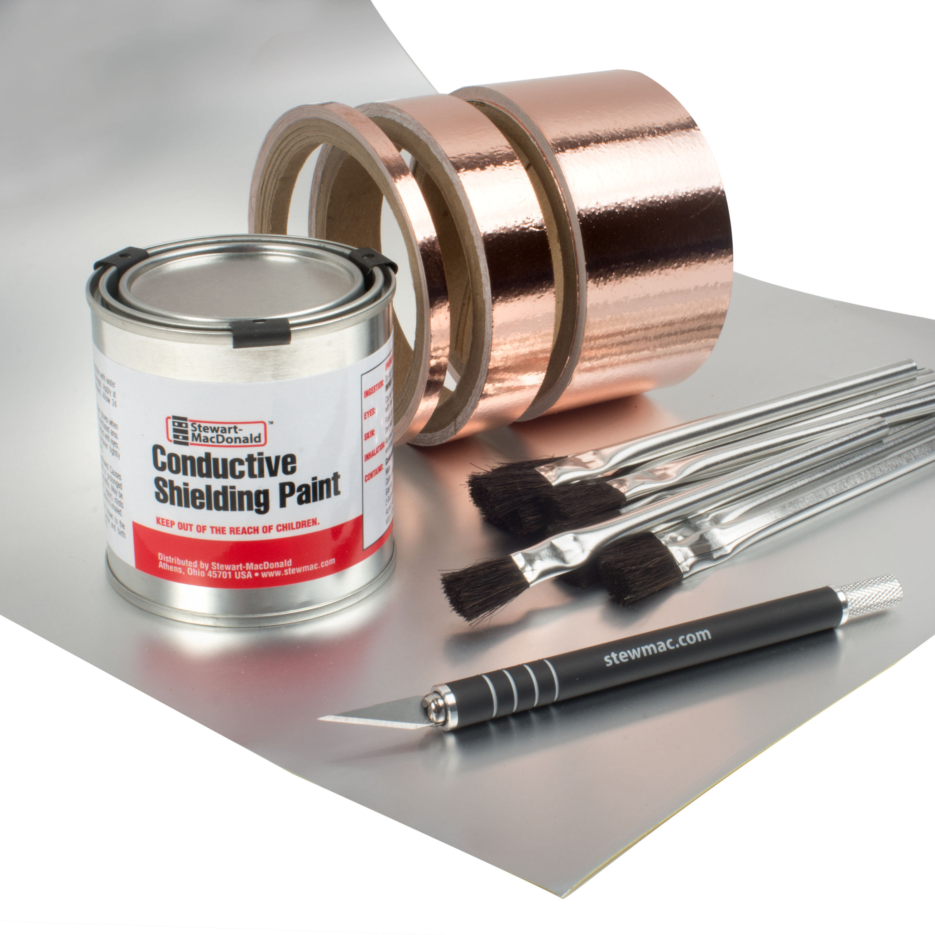 Dans ce coffret, vous recevrez une peinture de protection conductrice et un jeu de brosses à colle pour protéger rapidement les cavités de collecte et de contrôle, trois tailles de ruban de cuivre conducteur pour protéger toutes les collectes et toutes les tailles de cavités (ce ruban accepte la soudure), une feuille de protection de plaque de protection pour l’arrière des pickguards (essentiel pour les guitares Fender) et notre couteau de rasoir préféré pour couper et couper le ruban et la feuille proprement.