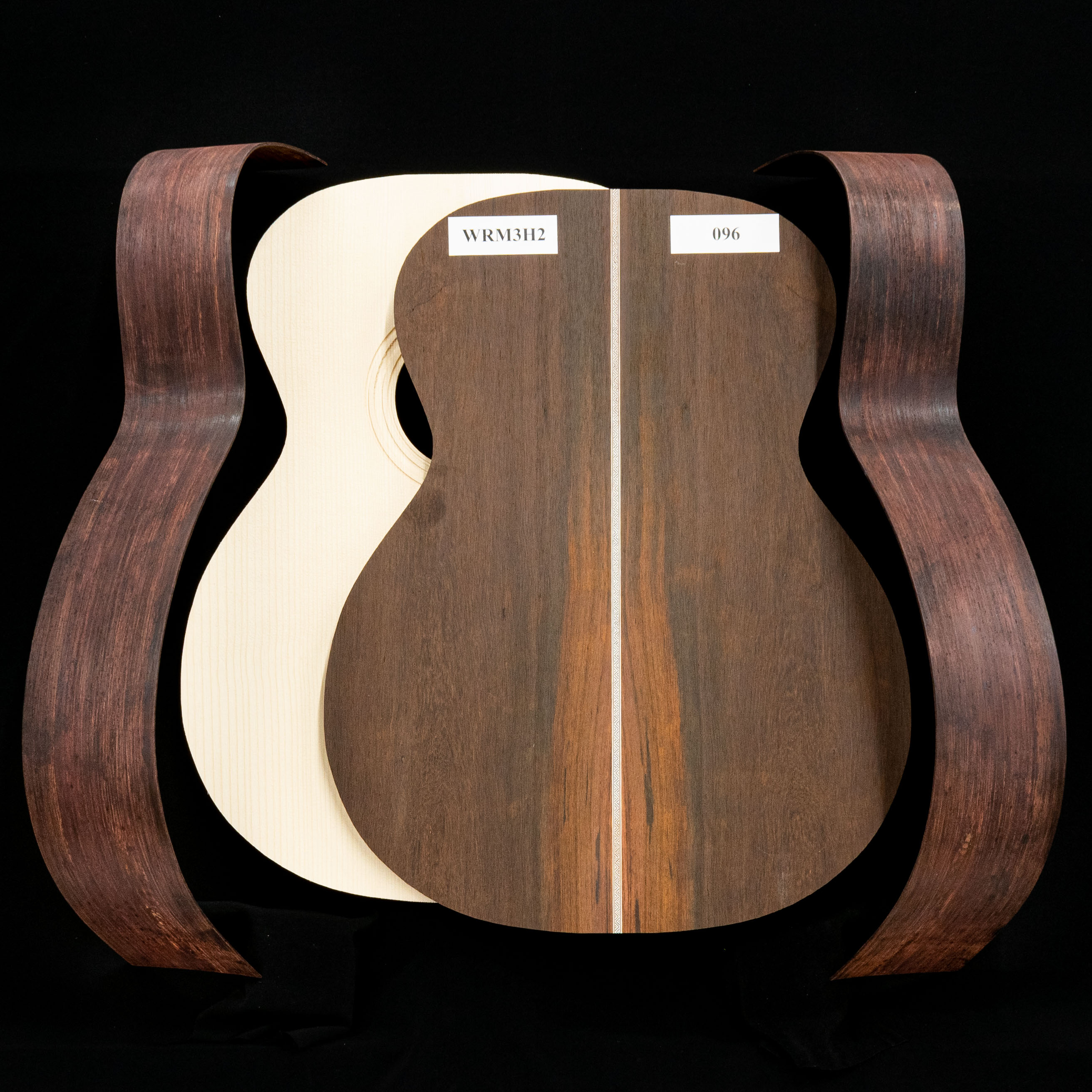 Soyons honnêtes, les bois sont la base de ces grandes guitares, et nous savions que nous devions les garder aussi fidèles que possible à l’original. Le bois de rose brésilien, qui a été utilisé au dos et sur les côtés des originaux, n’est plus disponible sur le marché, nous avons donc sélectionné à la main le bois de rose de Madagascar 5A (Dalbergia baronii) de la plus haute qualité du marché. Cette espèce de bois de rose ressemble (et sonne) à la vraie chose. Nous l’avons ensuite associé à l’Adirondack Red Spruce (Picea rubens) le plus léger et le plus rigide de notre réserve, comme ils l’ont fait à Nazareth dans les années 1930. Et enfin, nous avons sélectionné les fingerboards et les bridges en ébène les plus noirs pour ces kits. Comme il est illégal d’utiliser de l’ivoire éléphant, nous utilisons notre os le plus fin pour l’écrou et la selle.