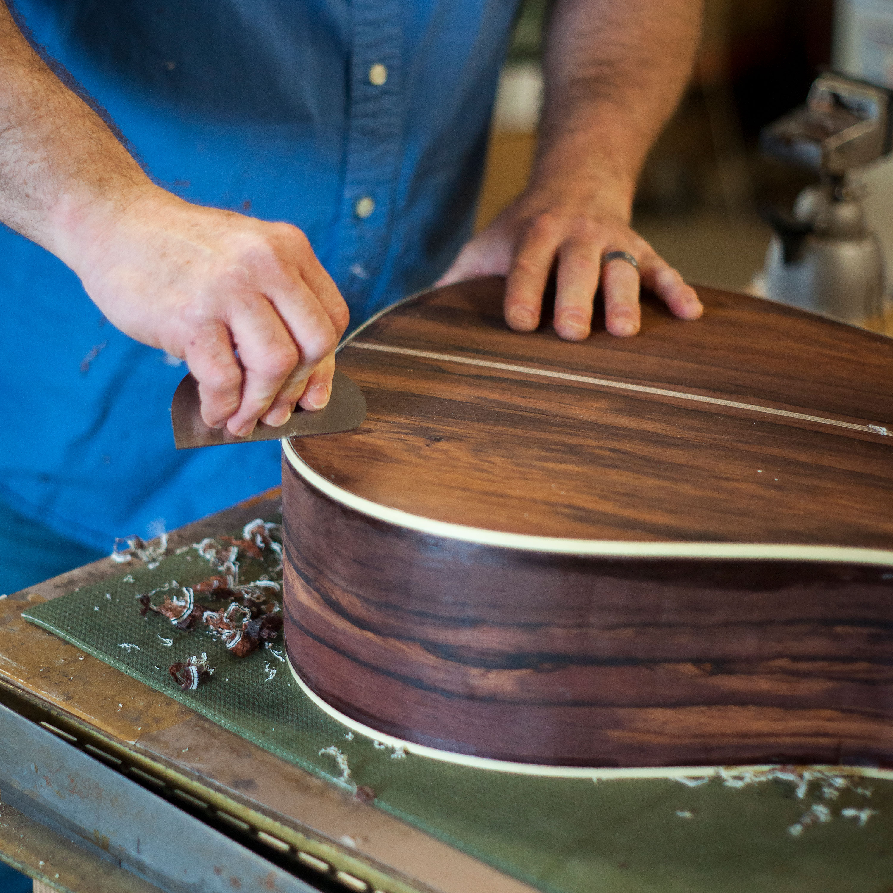 Nous avons ensuite associé le palissandre à la épicéa rouge Adirondack la plus légère et la plus rigide (rubens de picéa) de notre réserve, tout comme ils l’ont fait à Nazareth dans les années 1930. Pour vous rapprocher encore plus du ton vintage, le haut a été torréfié. Ce traitement thermique spécial modifie le bois au niveau moléculaire : le sommet devient beaucoup plus résonnant et réactif.