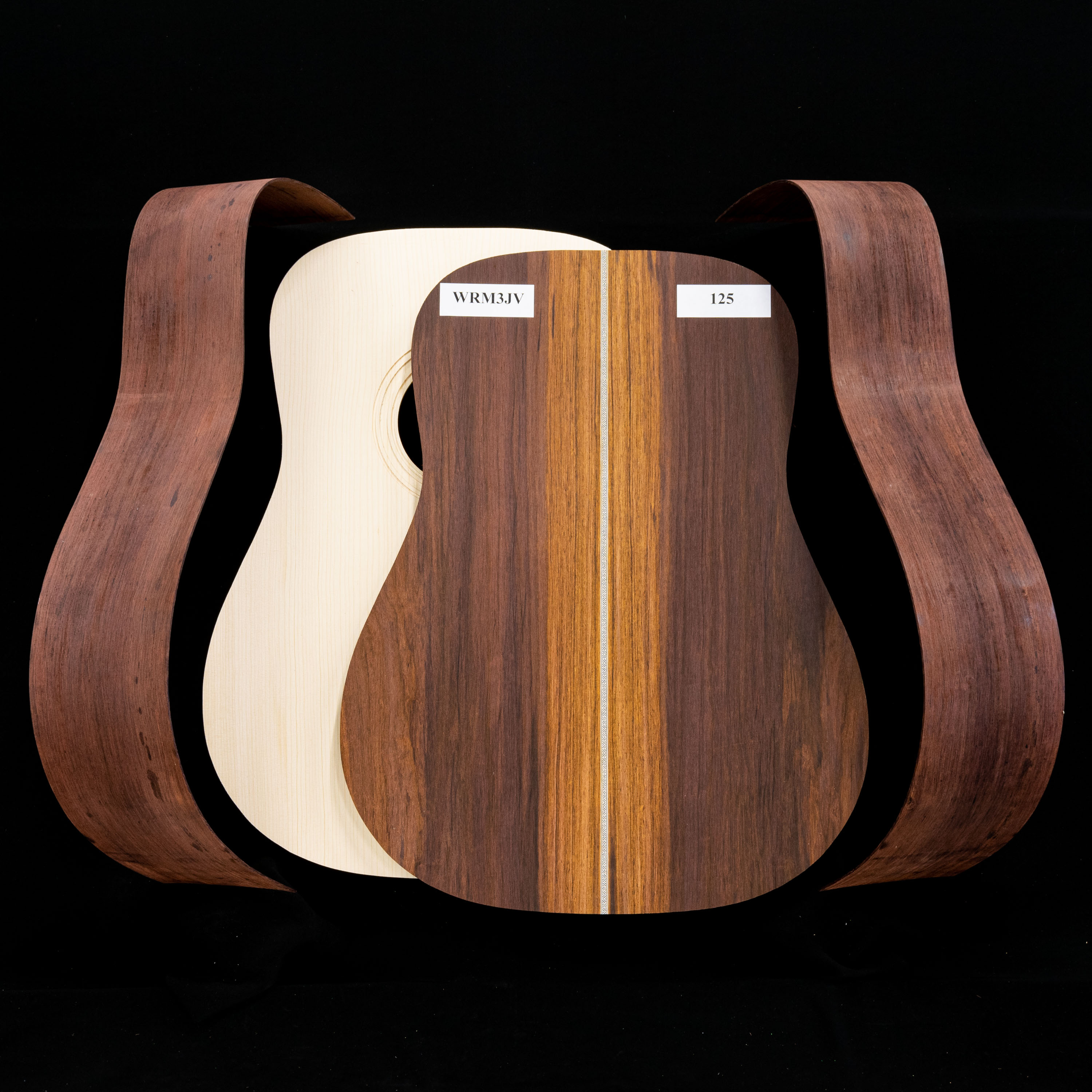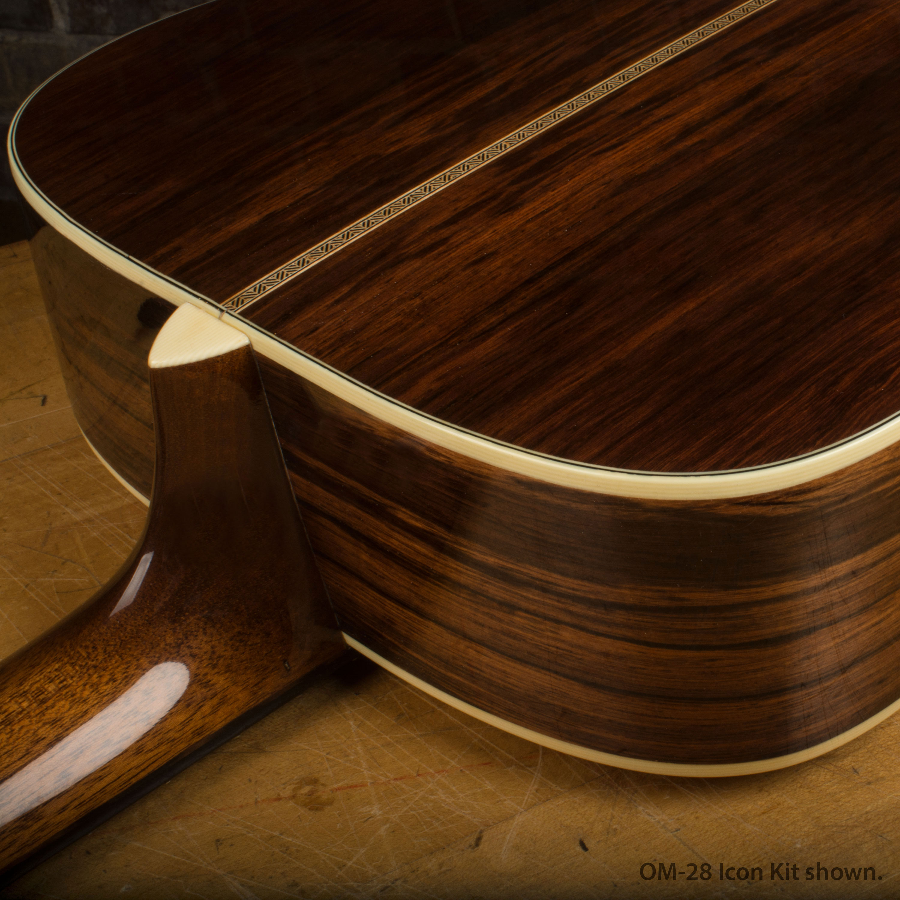 Soyons honnêtes, les bois sont la base de ces grandes guitares, et nous savions que nous devions les garder aussi fidèles que possible à l’original. Le bois de rose brésilien, qui a été utilisé au dos et sur les côtés des originaux, n’est plus disponible sur le marché, nous avons donc sélectionné à la main le bois de rose de Madagascar 5A (Dalbergia baronii) de la plus haute qualité du marché. Cette espèce de bois de rose ressemble (et sonne) à la vraie chose. Nous l’avons ensuite associé à l’Adirondack Red Spruce (Picea rubens) le plus léger et le plus rigide de notre réserve, comme ils l’ont fait à Nazareth dans les années 1930. Et enfin, nous avons sélectionné les fingerboards et les bridges en ébène les plus noirs pour ces kits. Comme il est illégal d’utiliser de l’ivoire éléphant, nous utilisons notre os le plus fin pour l’écrou et la selle.