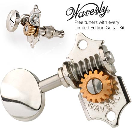 Les bois de ces kits sont vraiment uniques. C’est pourquoi nous avons décidé d’inclure GRATUITEMENT les meilleurs mécaniques pour compléter votre guitare : nos Waverly Nickel Tuners avec boutons ovales vintage. Ces machines de réglage faites à la main complèteront le look personnalisé avec la binding blanche, l’écrou à os et la sillet, et les pins de pont blanches.