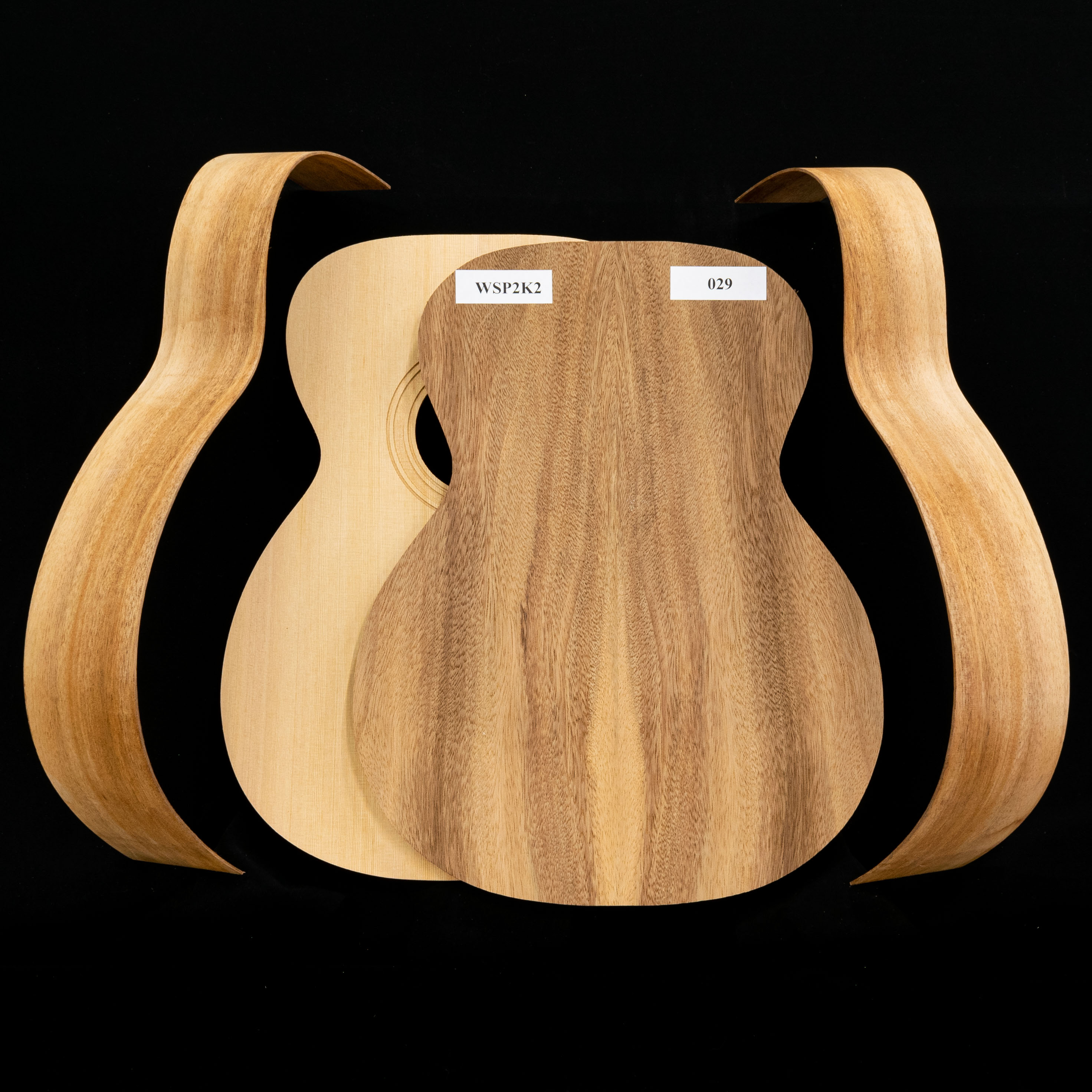 Nous avons photographié chaque ensemble individuellement. Ce que vous voyez sur la première image est le bois réel que vous recevrez. Zoomez et découvrez la silhouette unique de chaque ensemble, le grain et chaque détail du dos, des côtés et du haut de votre kit, puis commencez à créer la guitare de vos rêves.