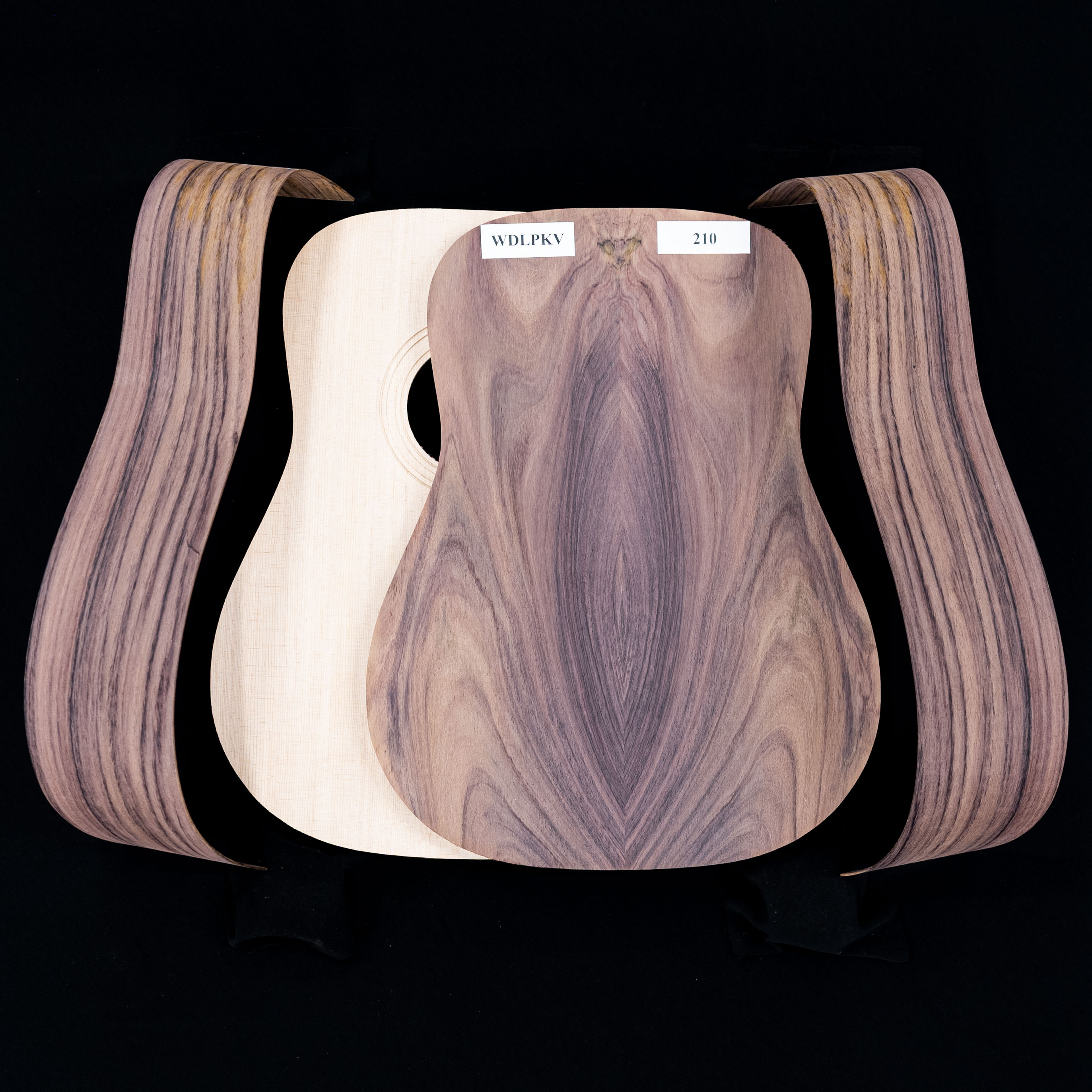 Bien que le bois de rose à grain sauvage puisse parfois être un défi à relever, nous avons pris soin de sélectionner des pièces stables, plates et bien comportementées. Nous avons précisément assorti les livres et avons rejoint le dos pour le couper à la forme souhaitée. Vous pouvez désormais créer votre guitare de rêve avec ce bois visuellement saisissant et fantastique.