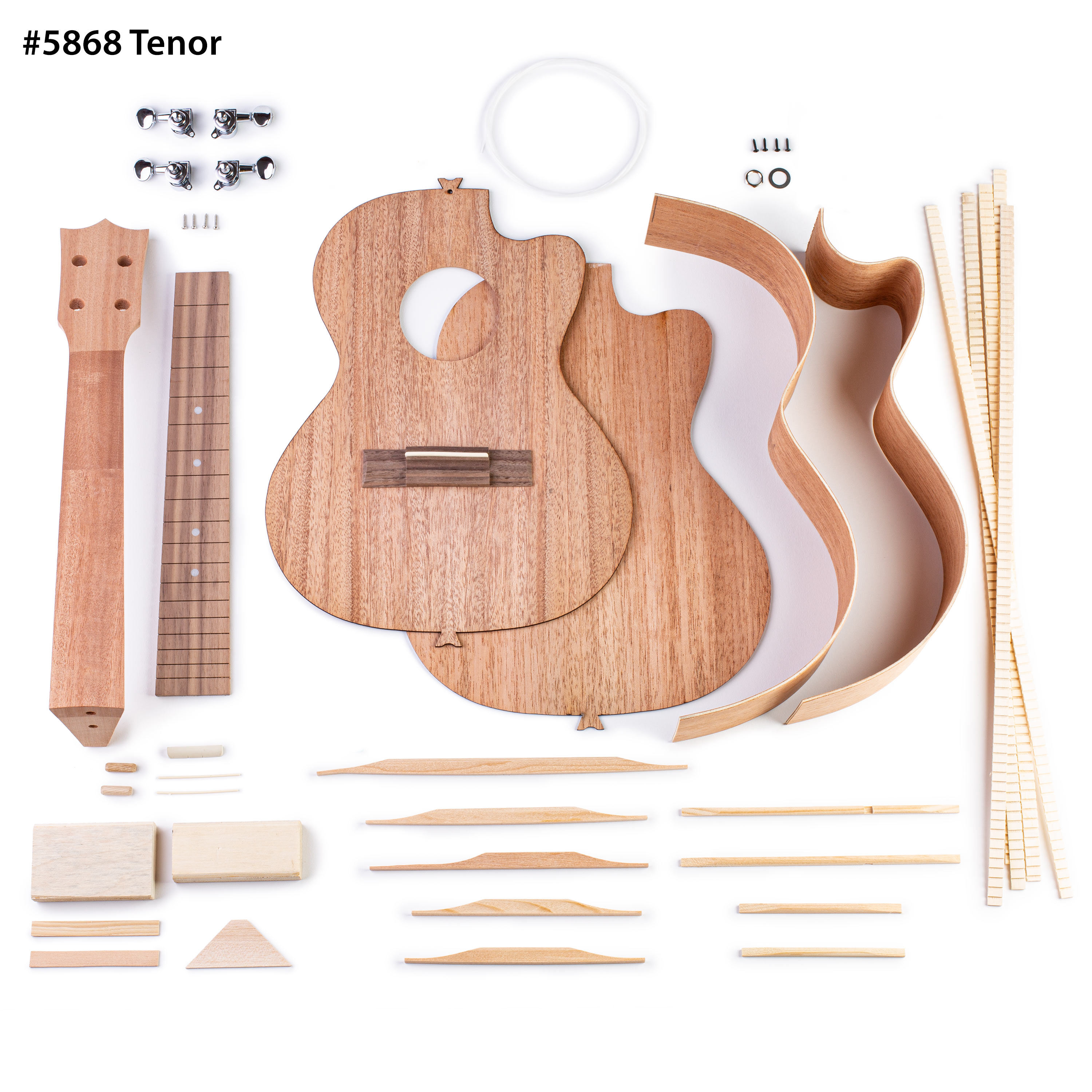 Our detailed instructions and bracing plans guide you through each step of the build, from start to finish! To reduce spring-back and help stability, the back and sides are made from high quality mahogany laminates—this will go a long way to ensuring your first build is painless and enjoyable. The solid mahogany top will only sound better the more you play it. Available in concert and tenor sizes.