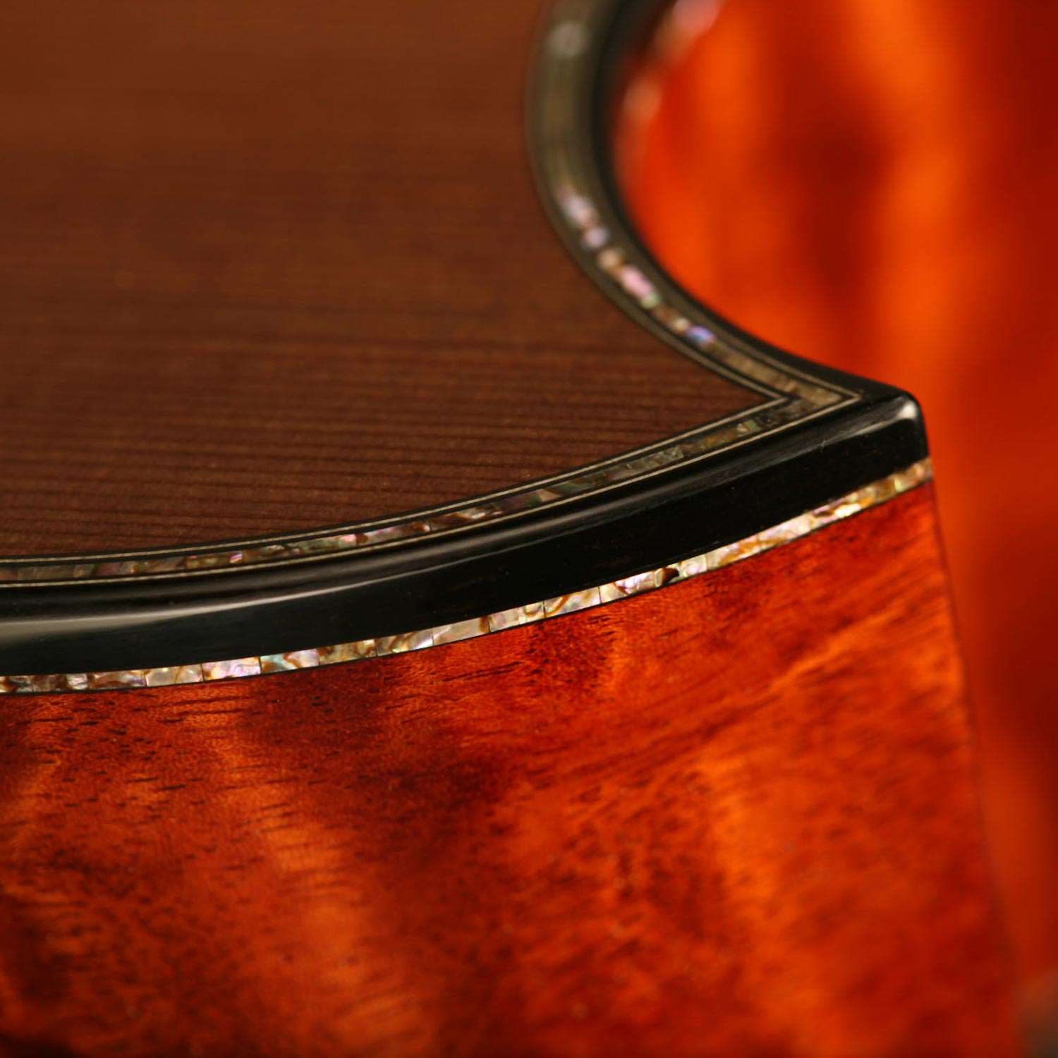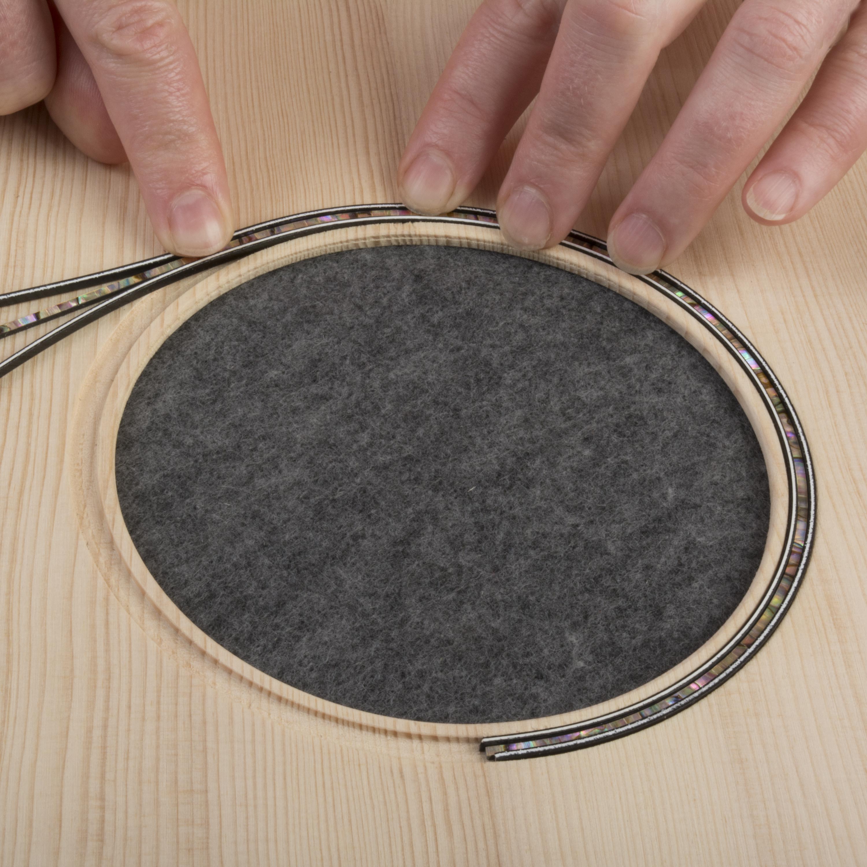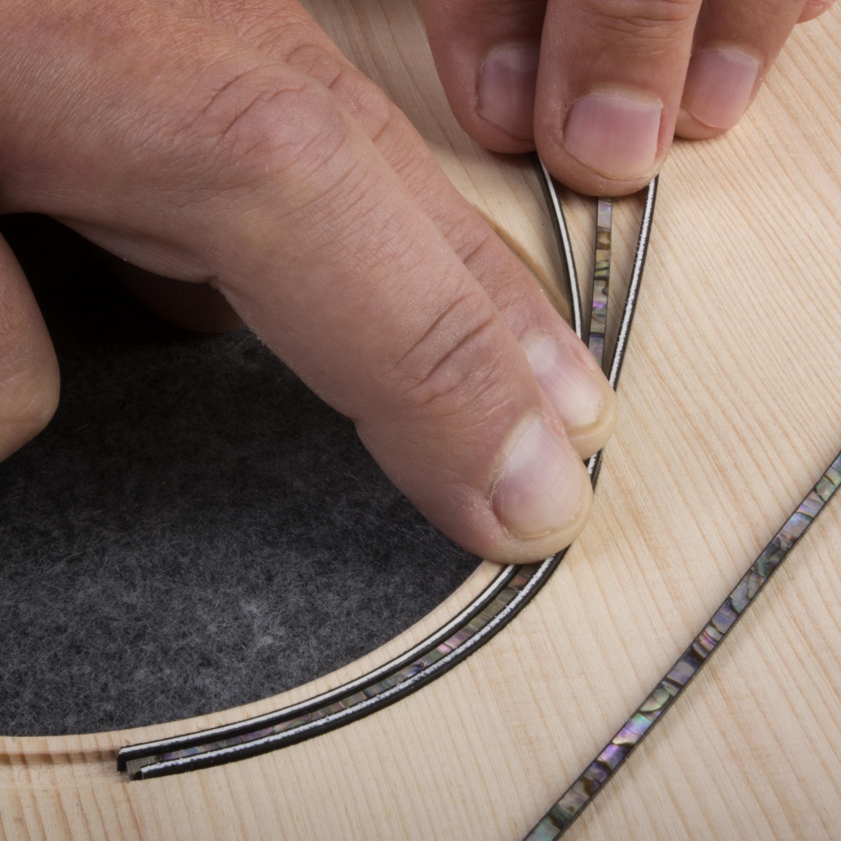 ZipFlex est une coque d' abalone verte sélectionnée sur une base flexible qui se plie à n'importe quelle courbe. Placez-le entre les bindings extérieures en bois et collez-les en une seule pièce. Zip !—vous avez posé le trou de son !