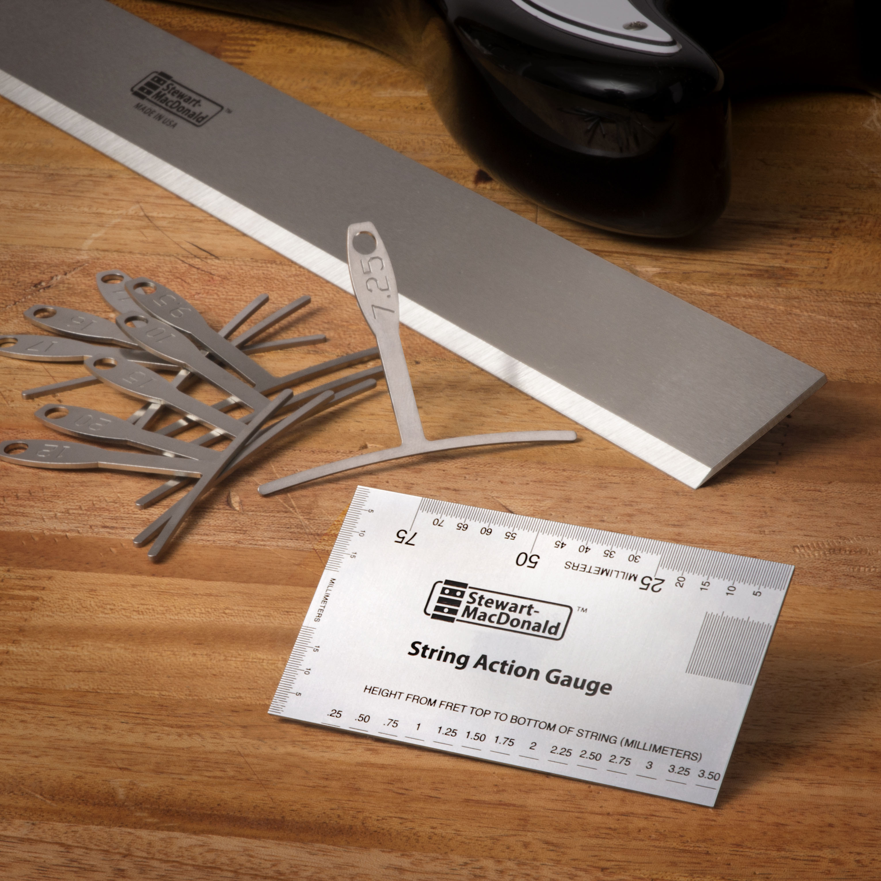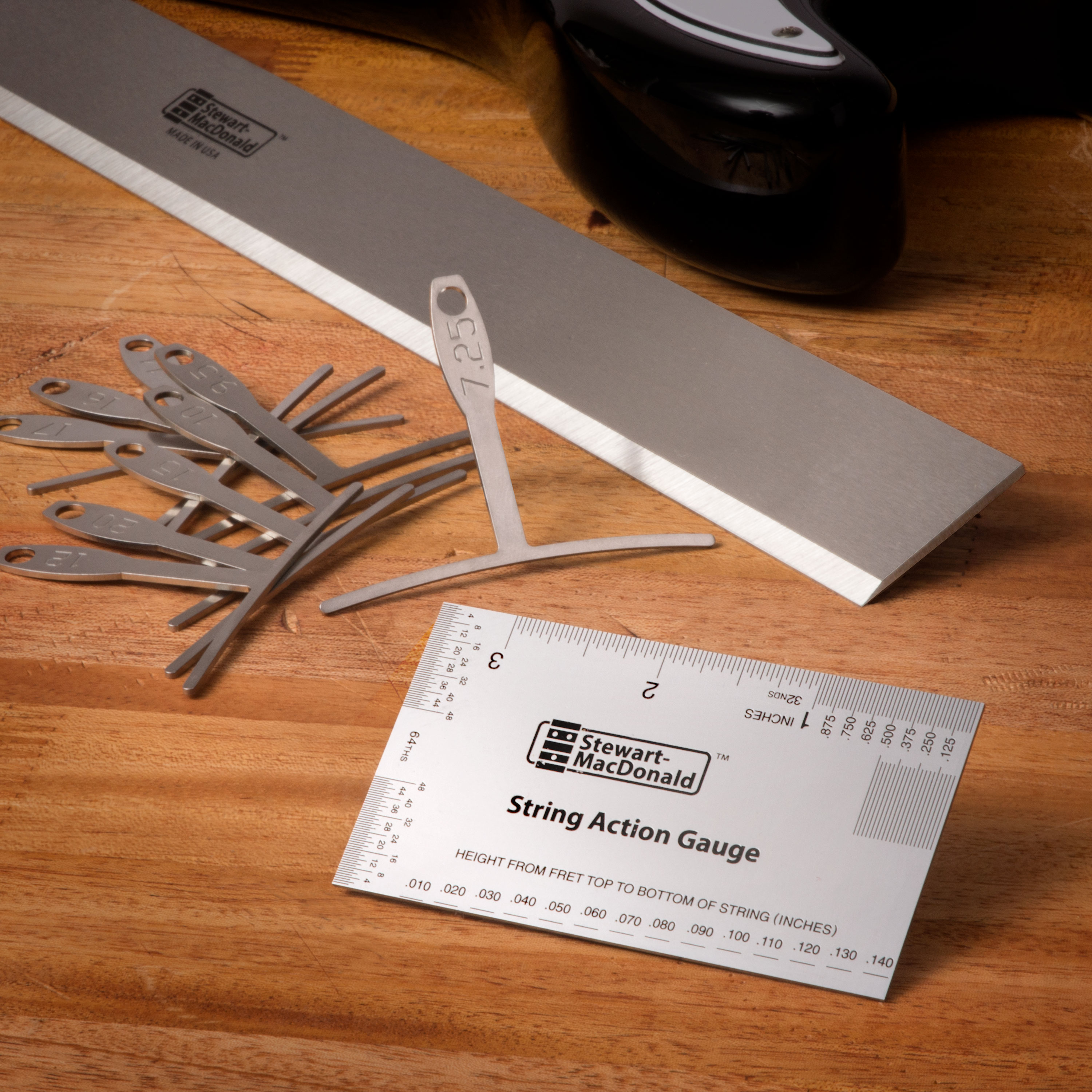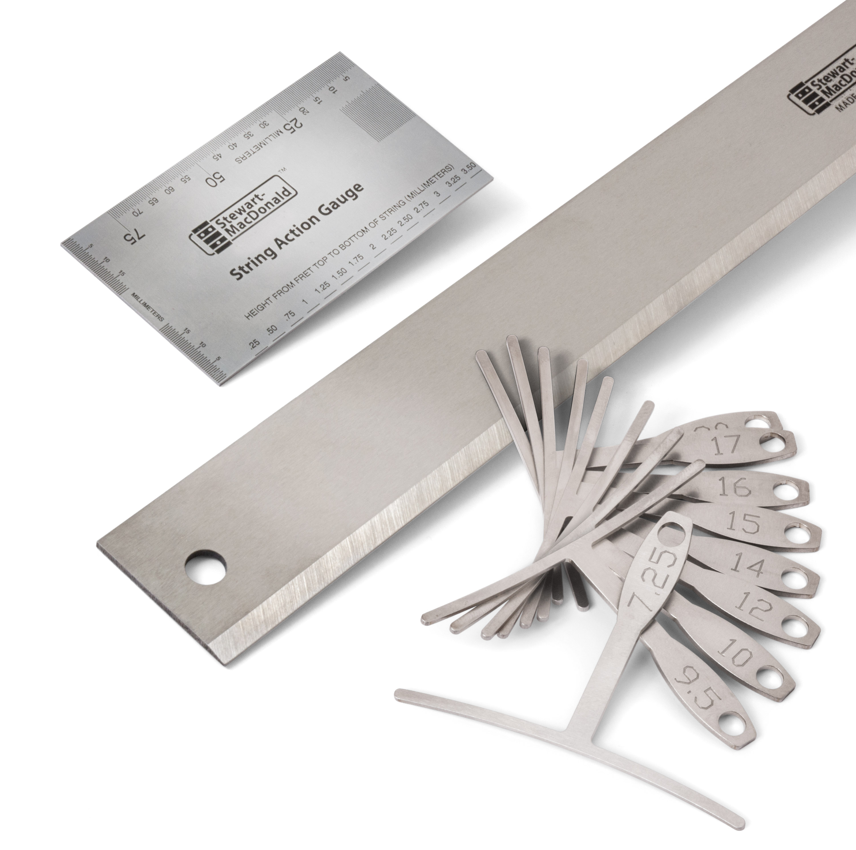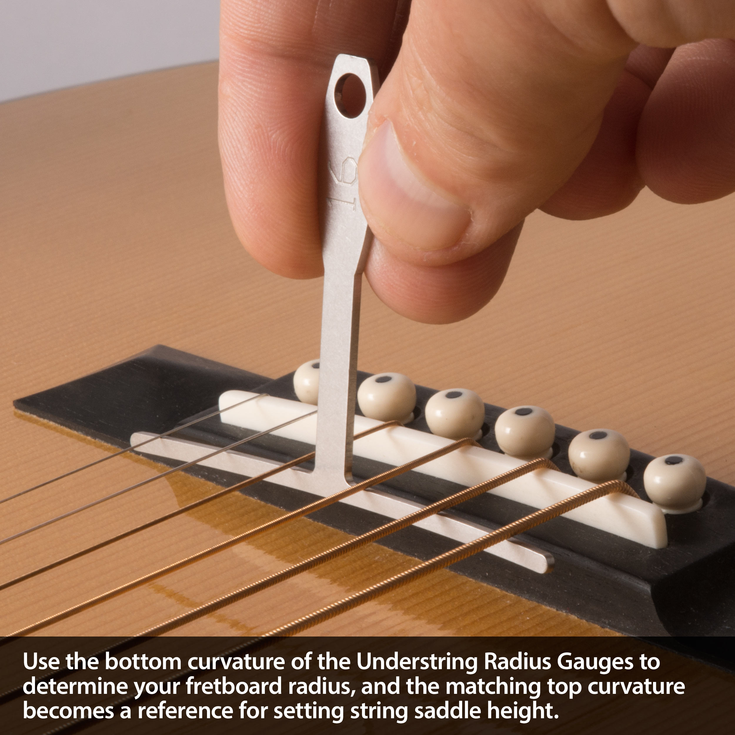 Une aide précieuse pour faire correspondre la hauteur du sillet de chevalet à la courbure de la touche et améliorer le confort de jeu. Le kit inclut 9 radius de touche différents en acier inoxydable usiné au laser pour plus de précision.