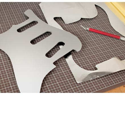 Dans cet ensemble, vous recevrez une peinture de blindage conducteur et un jeu de brosses à colle pour protéger rapidement les cavités de pickup et de contrôle, trois tailles de ruban en cuivre conducteur pour protéger toutes les collectes et toutes les tailles de cavités (ce ruban accepte la soudure), une feuille de blindage pickguard pour l’arrière des pickguards (essentiel pour les guitares Fender) et notre couteau à rasoir préféré pour couper et couper le ruban et la feuille proprement.