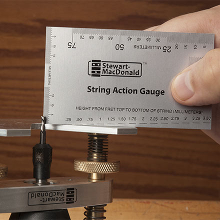 Le trio comprend également notre jauge de réglage des cordes, un outil indispensable pour mesurer la hauteur des cordes, des sillets et des plots de micros. Conçue spécifiquement pour les instruments à cordes, elle vous permet de réaliser vos mesures plus rapidement et avec plus de précision qu’une règle standard, et donc de régler parfaitement votre guitare ou votre basse.