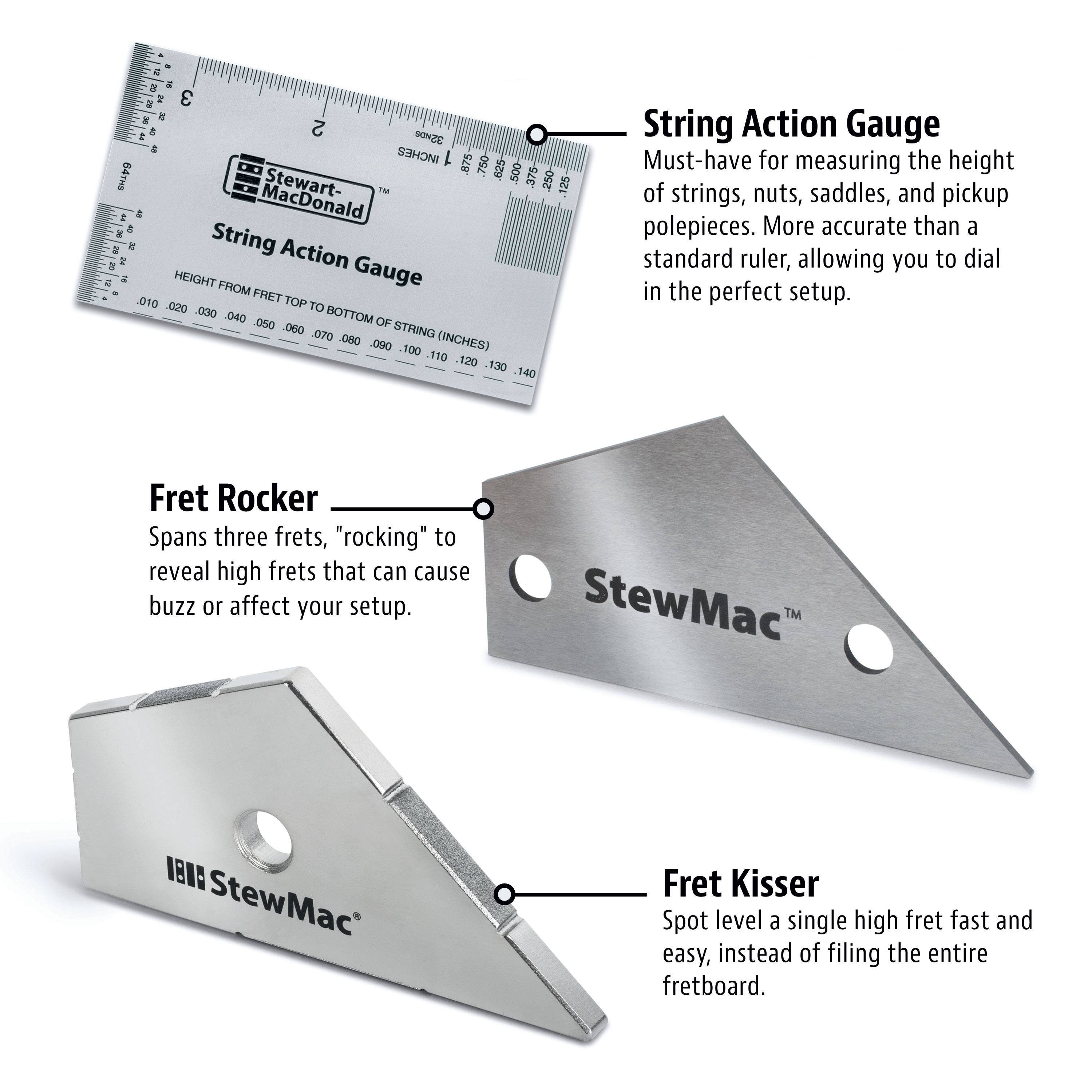 Le trio d’outils de frettage de précision combine trois des outils les plus populaires et les plus importants pour régler et réparer une guitare. Que vous ayez des années d’expériences ou que vous fassiez vos premiers pas en réparation de guitare, ce kit contient tout ce dont vous avez besoin pour identifier, mesurer et corriger avec facilité et rapidité les problèmes de frettes les plus courants.