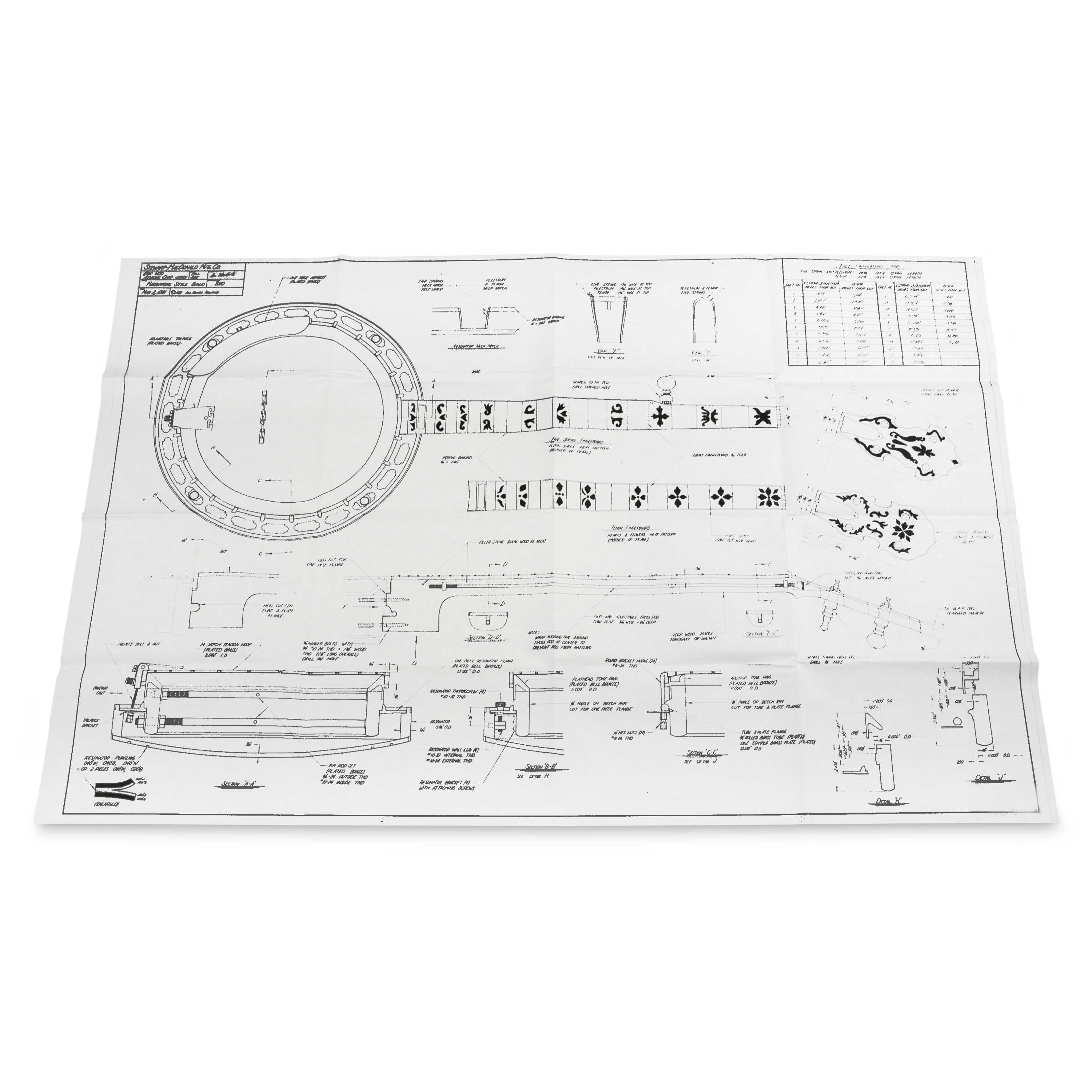 Comprend des motifs d’incrustation, des dimensions pour l’ajustement des anneaux de tonalité, des brides et des cols de résonateur, et des détails métalliques. Dessiné par Don MacRostie et fourni plié.