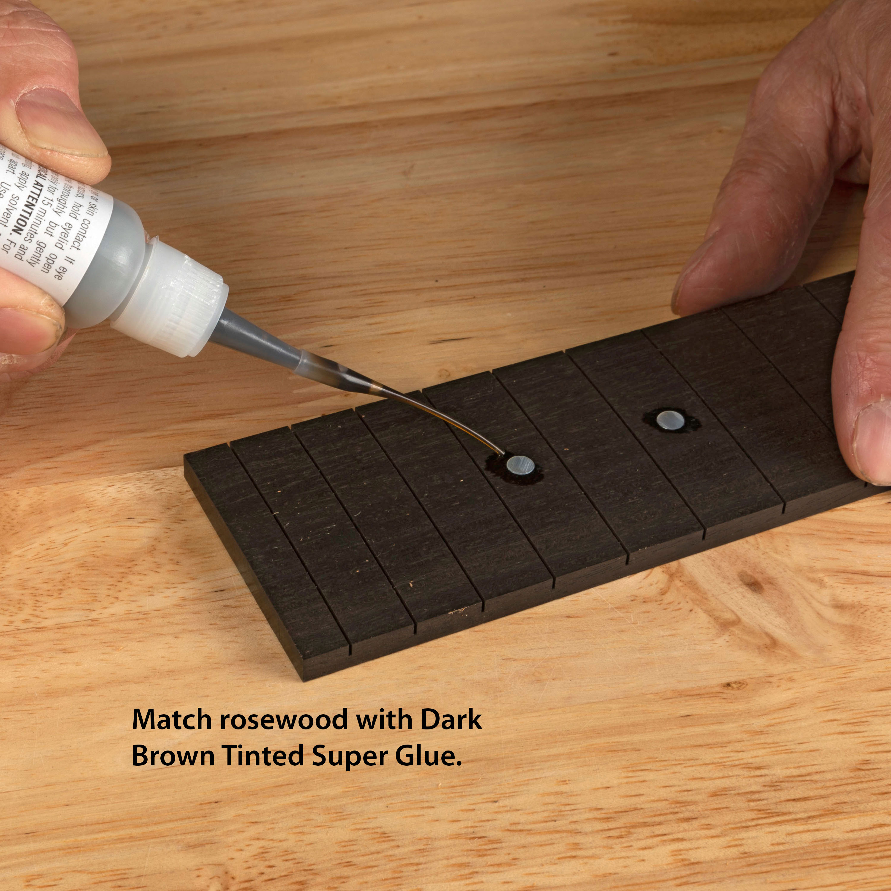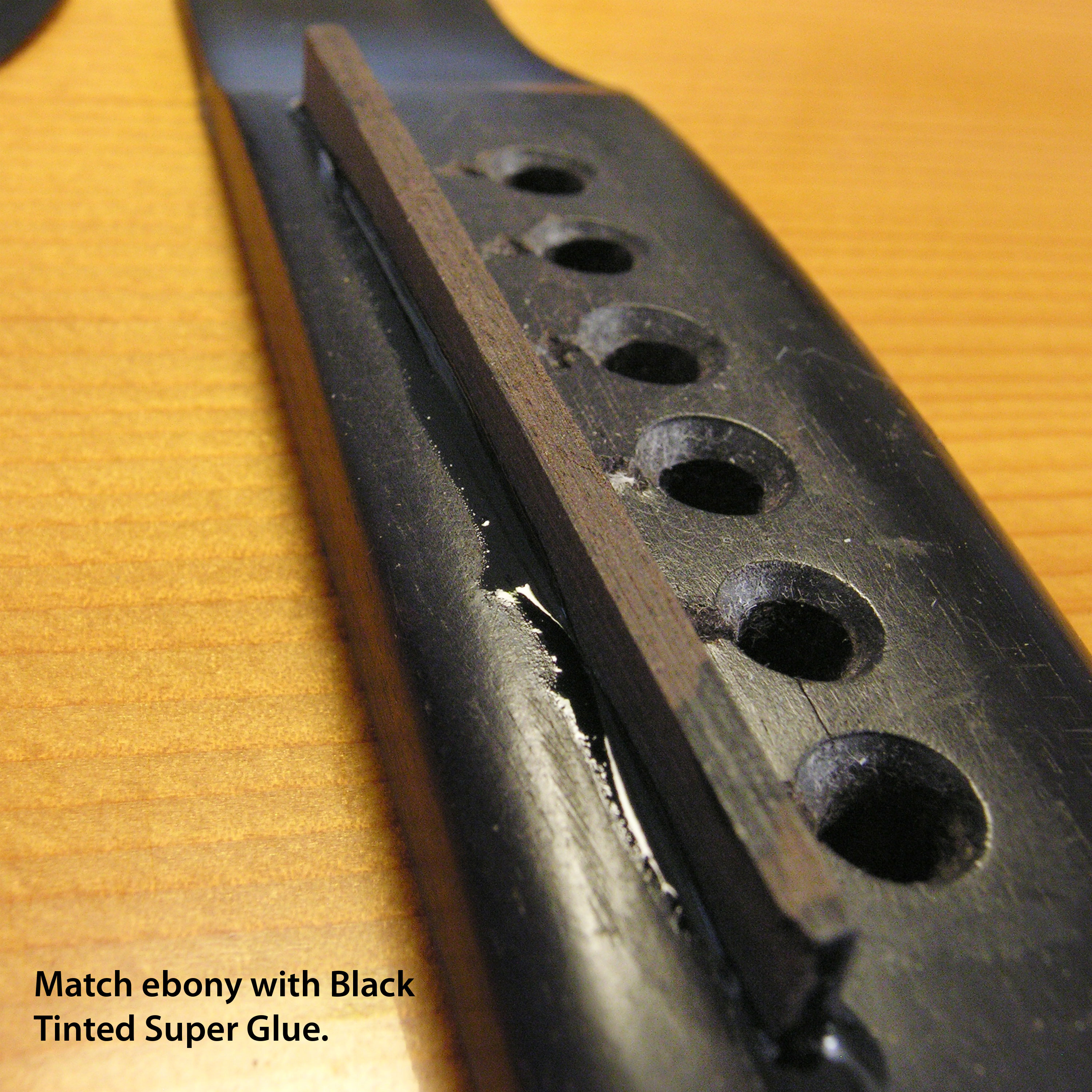 Le noir se fond bien avec les réparations en ébène, ce qui est pratique pour travailler sur les plaques d’attelage et les ponts. Remplissez également autour de l’inlay sur une placage de tête noire ! Bouteille de 1 once.