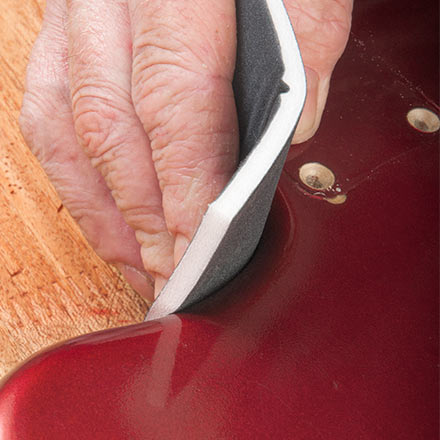 Utilisez les coussinets Micro-Mesh Soft Touch avec un peu d’eau savonneuse comme lubrifiant pour produire un effet miroir sans rayure (éviter de tremper les coussinets dans l’eau lorsqu’ils ne sont pas utilisés). Nous les utilisons régulièrement dans nos propres magasins pour les retouches de finition et la réparation des rayures sur les pickguards. Utilisez-les également pour polir les grilles.