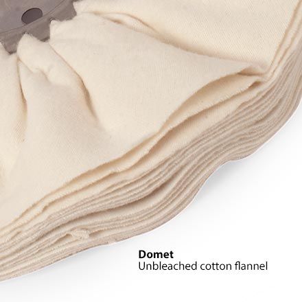 Le coton Domet est le plus doux du marché. Utilisez la flanelle Domet avec un composé fin pour obtenir une brillance très élevée. Une configuration de tampon polyvalente utilise des roues Canton d’un côté (composé moyen) et Domet de l’autre (composé fin).