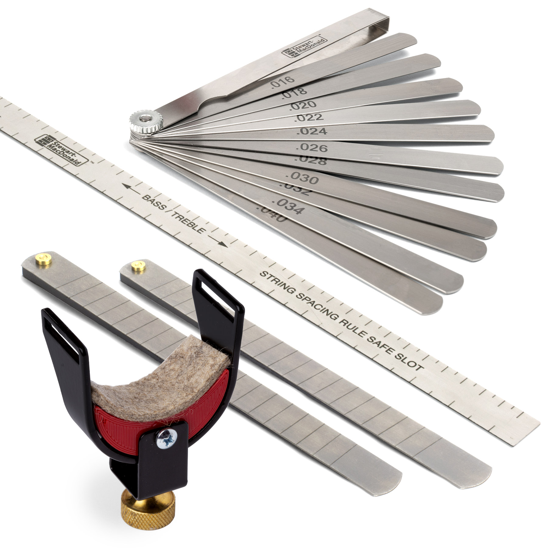 Cet ensemble comprend des wedges coniques pour les guitares électriques et acoustiques pour marquer votre ligne de garniture et une version fine de notre règle d’espacement des cordes pour montrer où placer vos fentes à corde. Faites-le glisser dans la fente de sécurité, comme une jauge d’épaisseur, et voyez exactement où chaque corde appartient. Pas de mesure, de division ou de calcul. Remplacez la règle par vos jauges d’épaisseur et vous êtes prêt à couper les fentes des écrous. Merci à luthier Ron Baran pour l’idée d’ajouter cette règle d’espacement mince à l’ensemble.