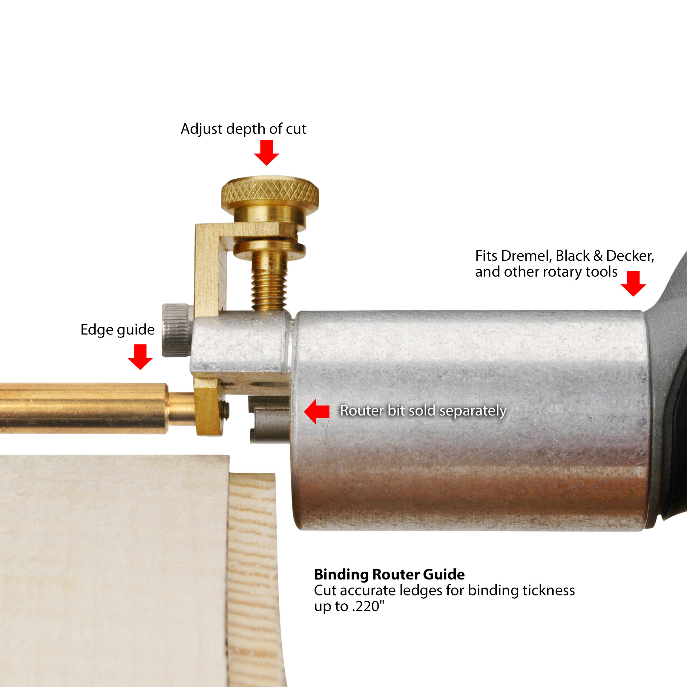 Fabriqué en aluminium et laiton usiné avec précision, il est idéal pour fresado les bords des guitares et des mandolines de arche, où une base de routeur standard ne fonctionnera pas. Il est également parfait pour les coupures et autres endroits difficiles à atteindre.