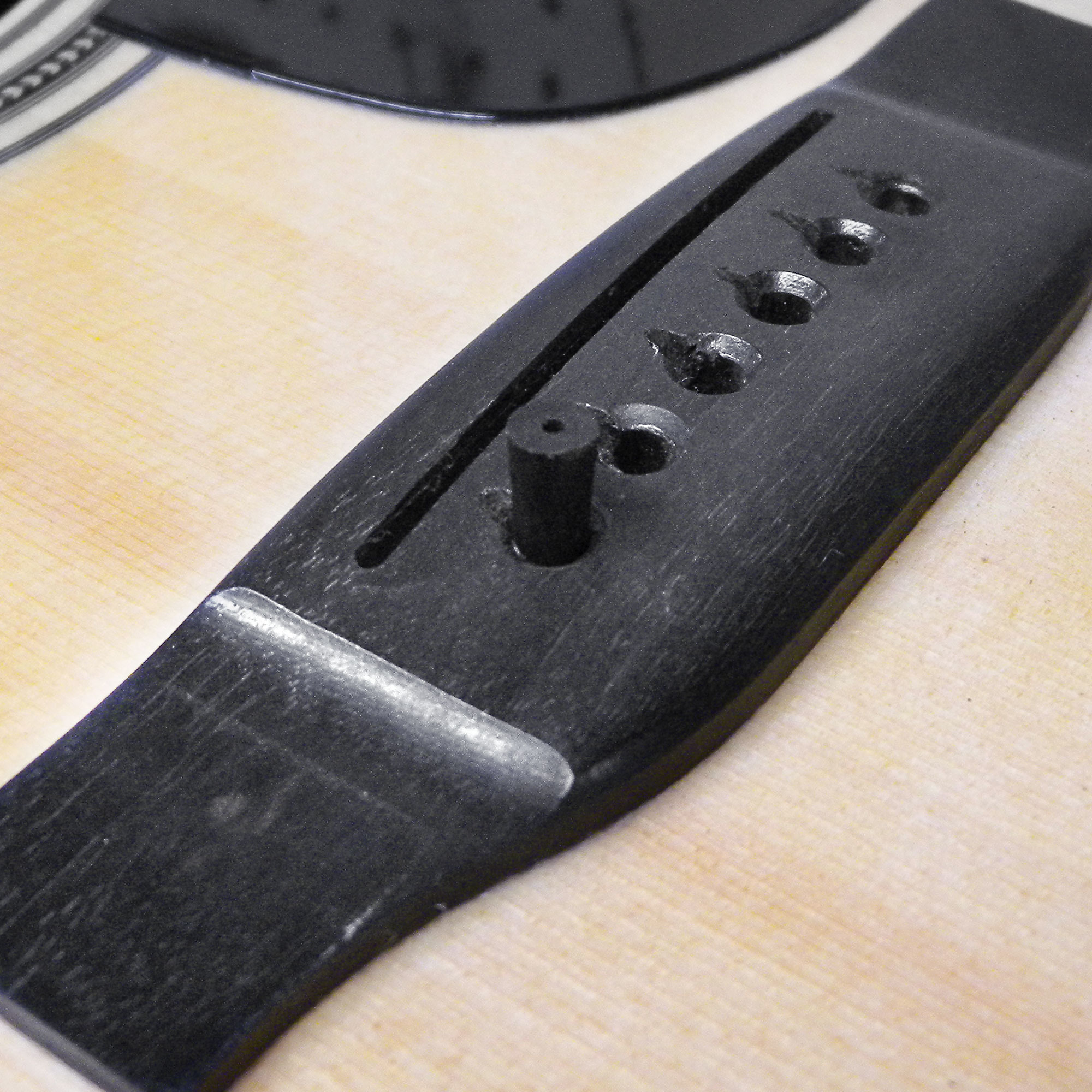 Un pont acoustique avec un trou de goupille de pont usé peut être difficile à réparer. Vous pouvez aléser le trou et utiliser une broche de pont surdimensionnée, mais cela n’a pas l’air formidable et ce n’est pas une option réaliste pour les instruments de collection.