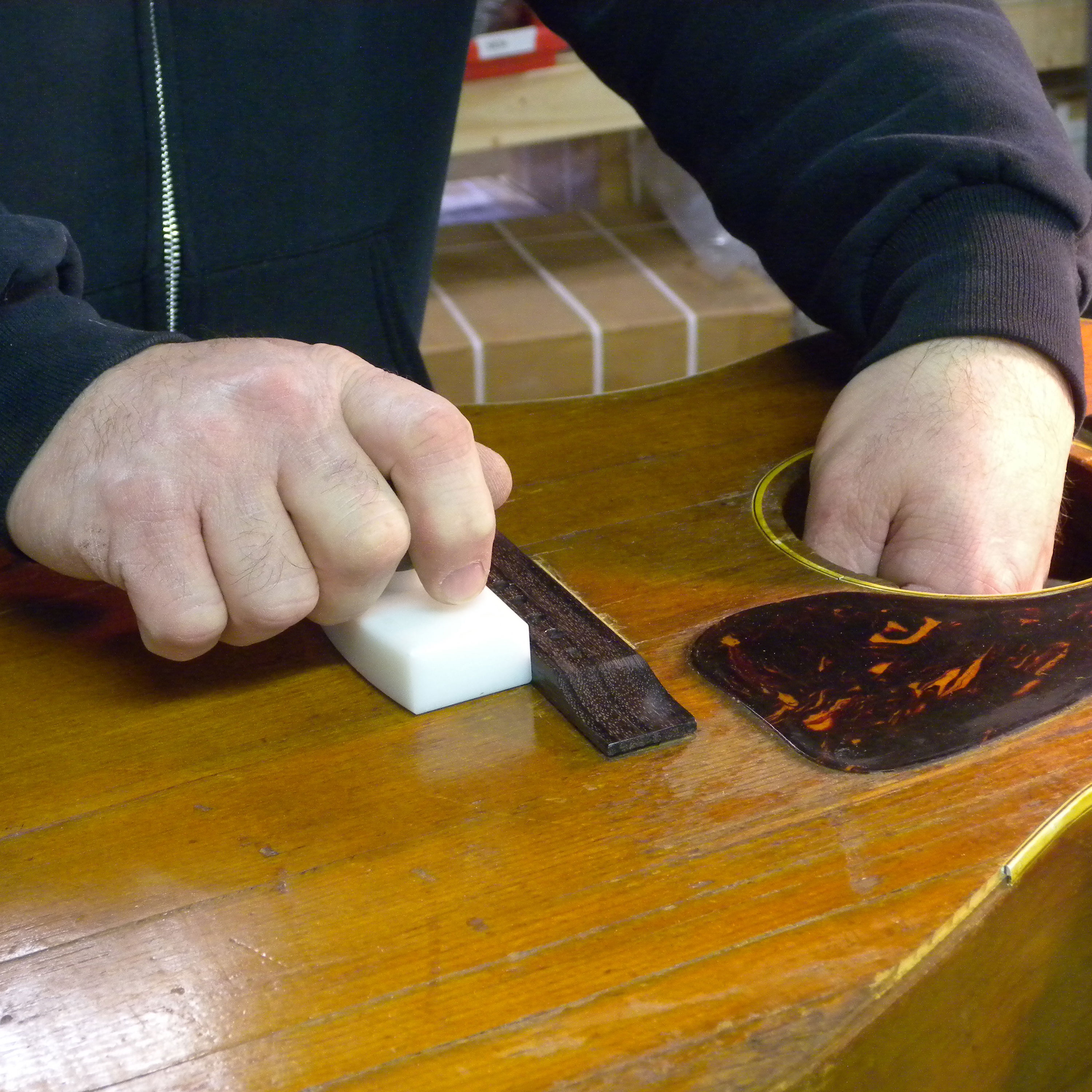 . Il est difficile de retirer la plaque de pont d'une guitare acoustique. Après avoir ramolli la colle avec de la chaleur, il faut une force soigneusement contrôlée pour séparer la plaque de la partie supérieure délicate de la guitare. Dans le même temps, vous devez protéger le haut contre les fissures sous pression. Notre ciseau à plaque Bridge et notre chariot de support supérieur travaillent ensemble pour y parvenir.