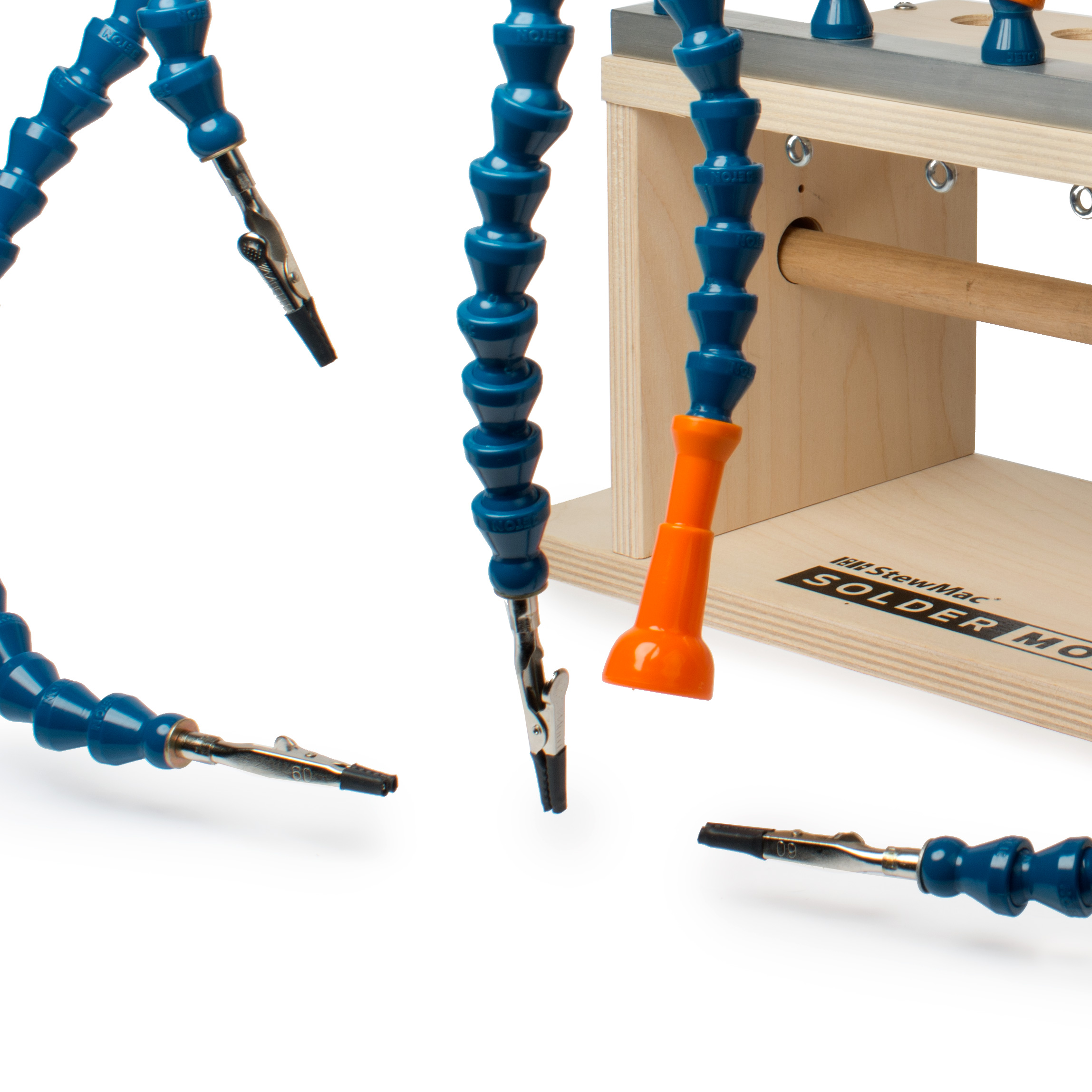 Le Solder Monster maintient votre travail pendant que vous soudez, avec de longues tentacules uniques pour atteindre les cavités de guitare. Il s’accroche aux petits composants ou aux pickguards entiers sans les rayer. Son distributeur de fil intégré et son support de rangement d’outils gardent votre paillasse propre et organisée.