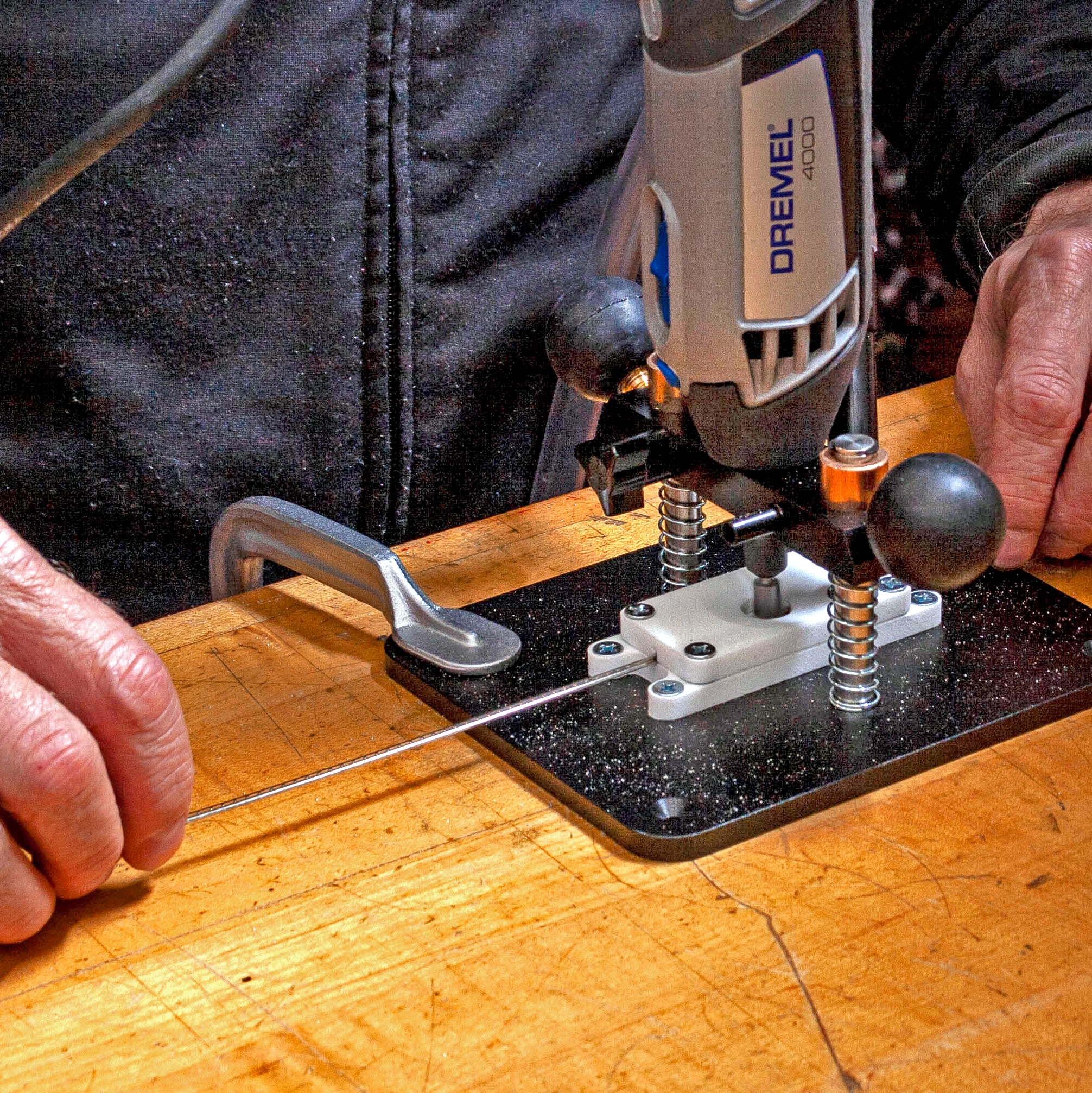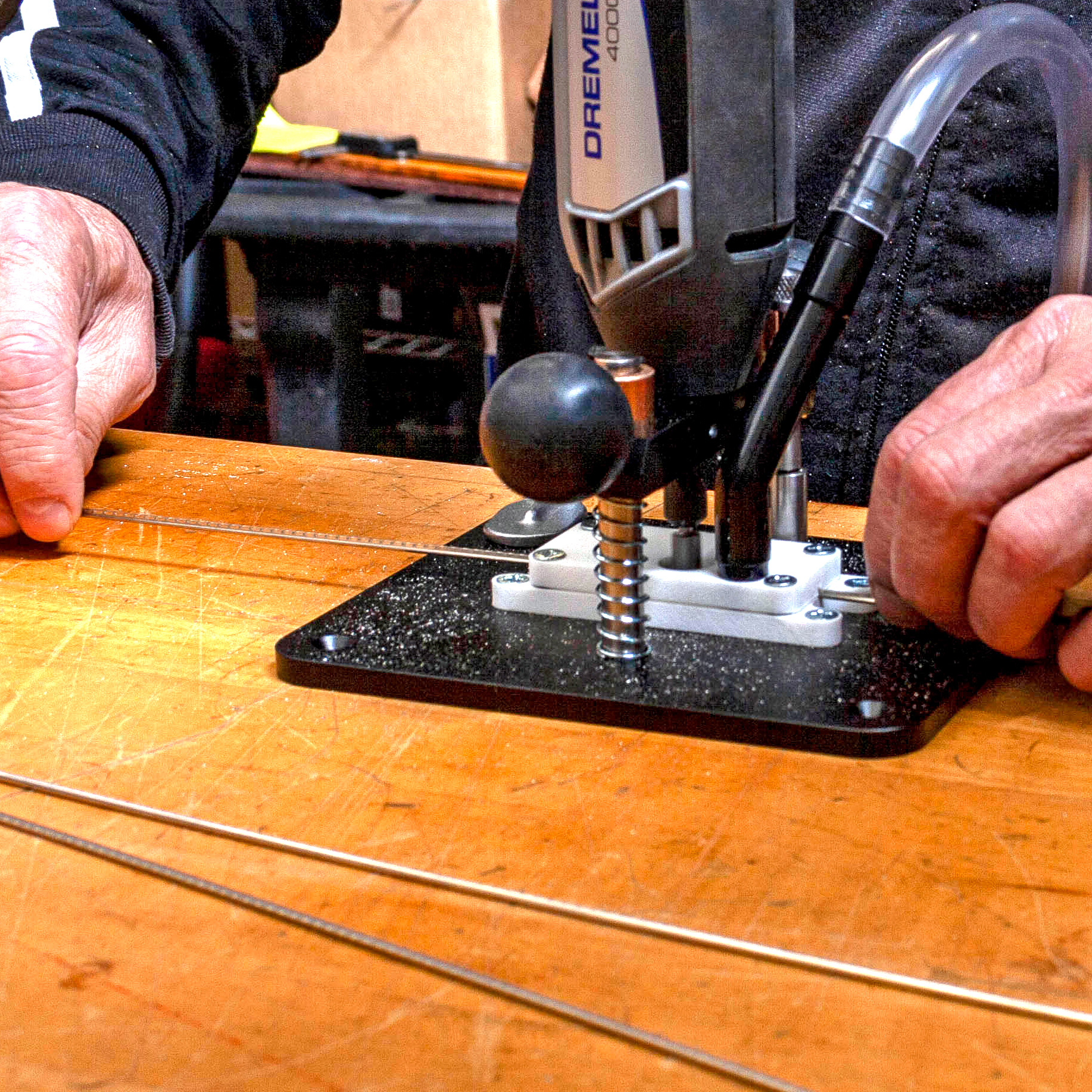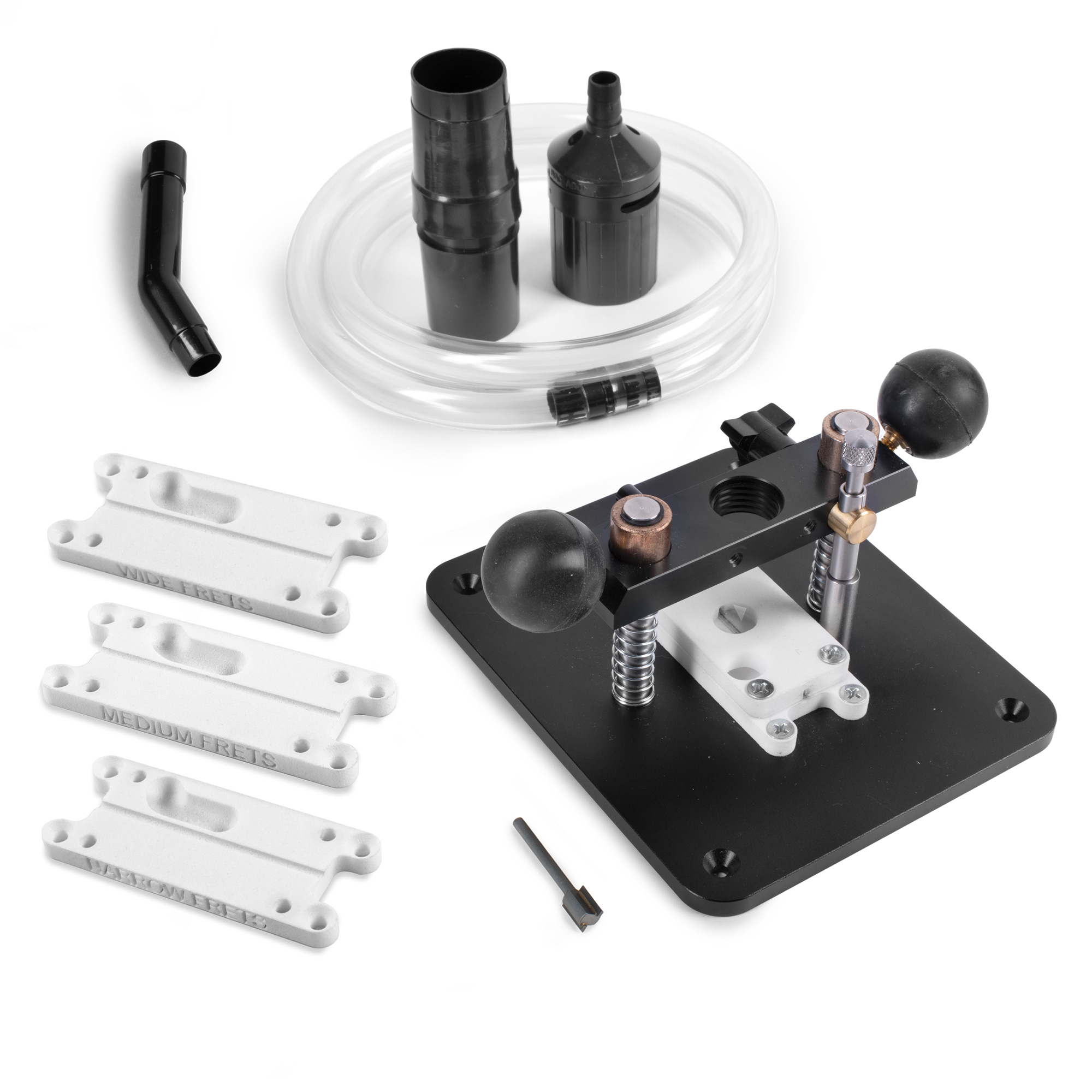Adaptez-vous : il vous suffit de monter un Dremel dans la base plongeante à ressort et d’alimenter votre fil de frettes à travers l’une des trois cartouches interchangeables de taille adaptée à la couronne. Au fur et à mesure que le fil passe, un trépan en carbure fraise la patte jusqu’à la hauteur cible. Les deux butées de profondeur (une grossière, une fine) vous permettent de régler la coupe, décollant de moins de 0,010" par passe.