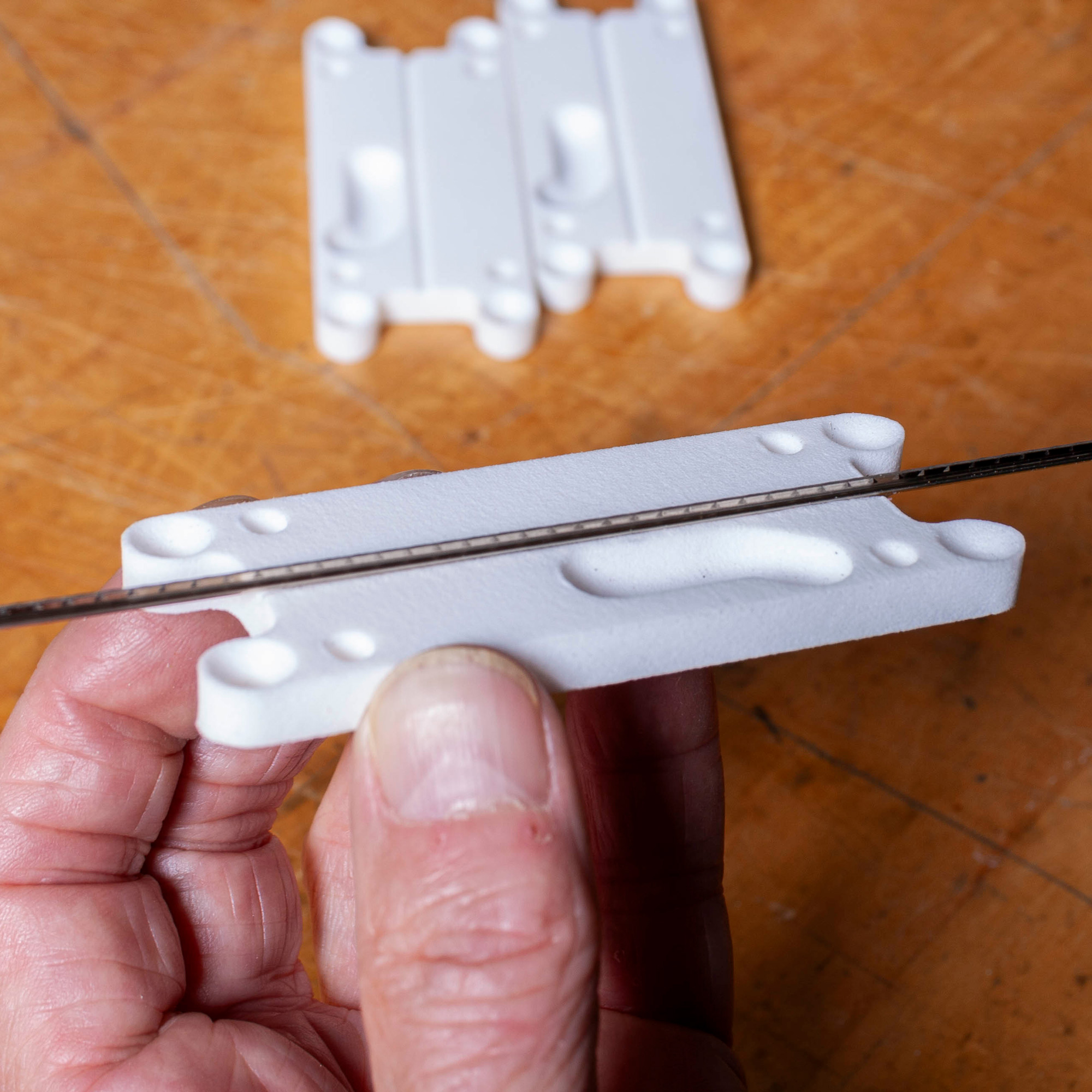luthiers pro de StewMac, Erick Coleman, Josh Hurst et Paul Lampley, ont développé la solution : le réducteur de patte de ret permet un réglage précis de la hauteur de patte pour un ajustement précis sans modifier la fente. Cet outil de raccourcissement des pattes fournit des résultats rapides et cohérents sur toute la longueur du fil de frettes.