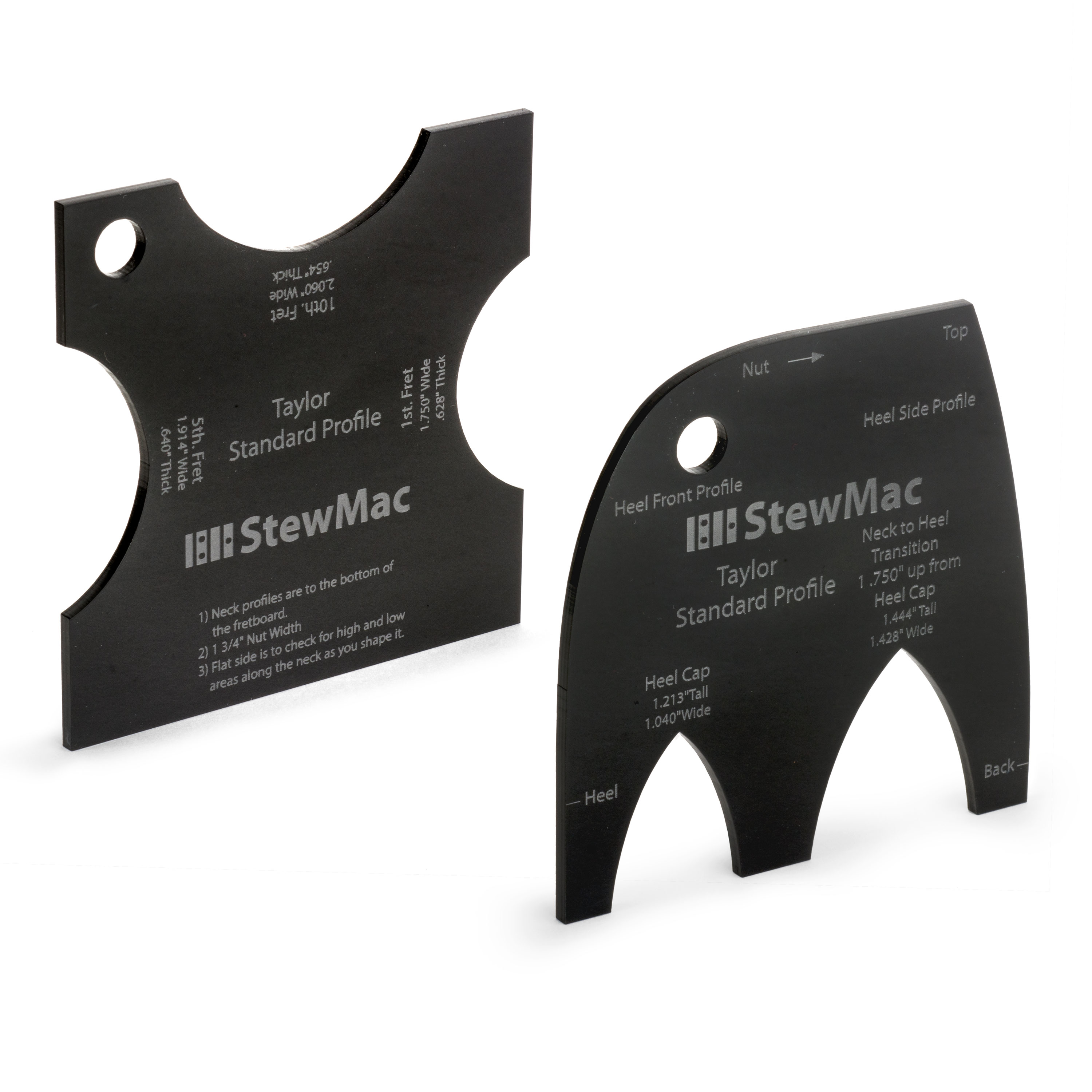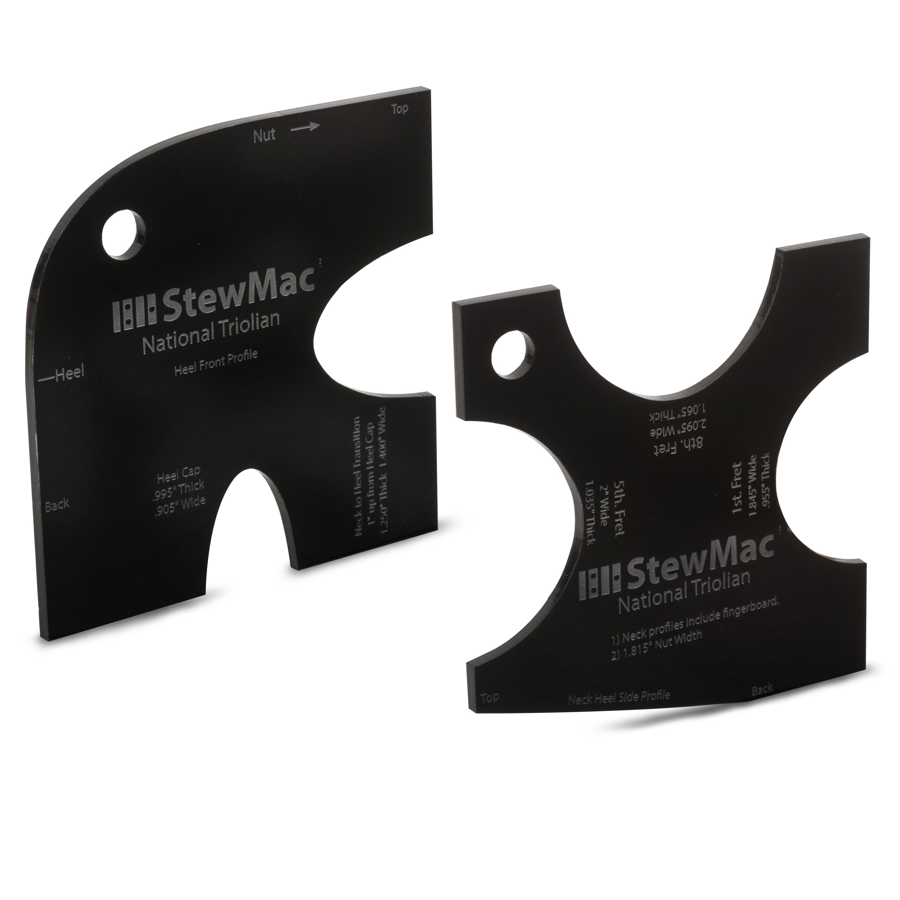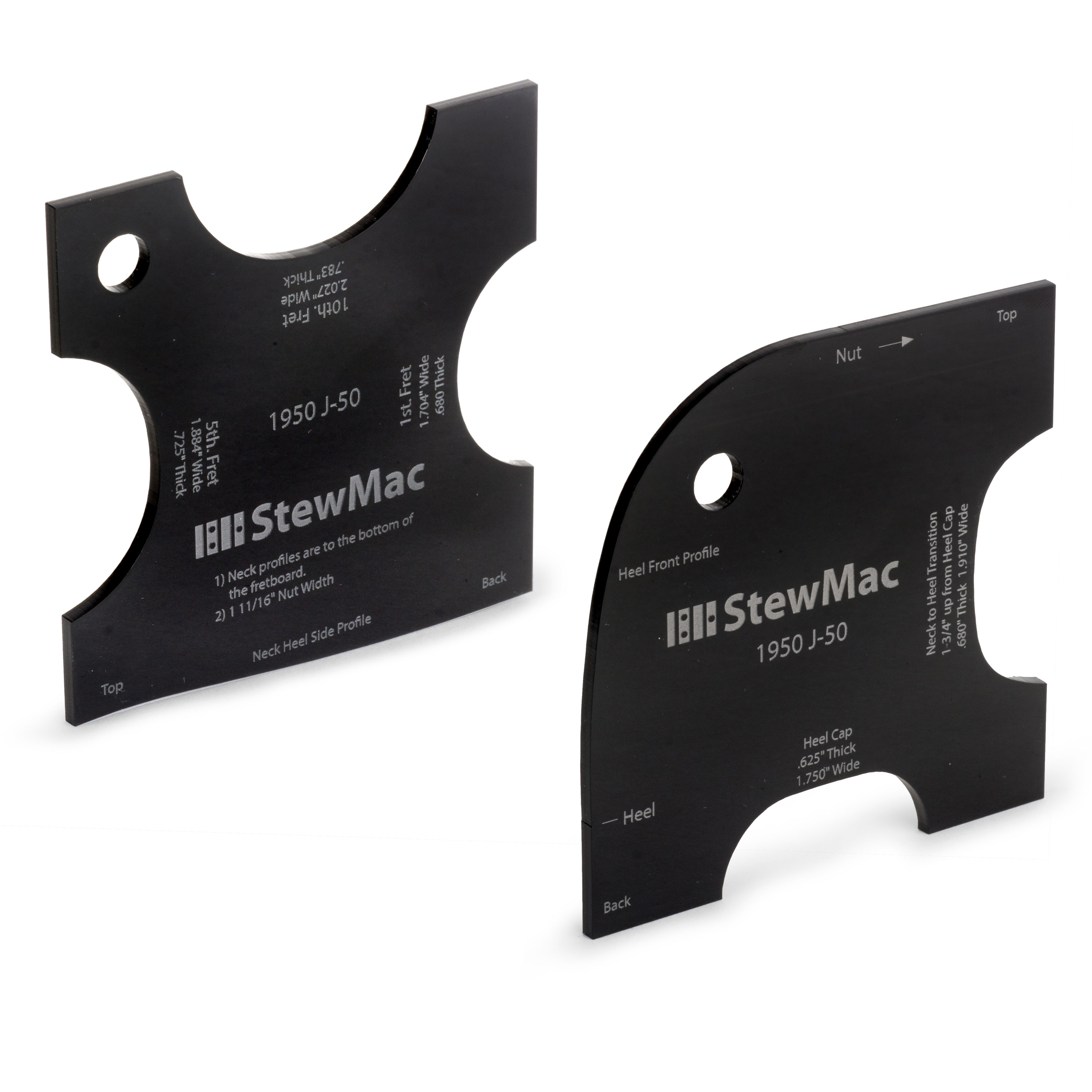 Tout ce dont vous avez besoin pour réaliser des reproductions parfaites des cous recherchés. Ces nouveaux modèles présentent les contours exacts de la forme du manche à partir des 1ère, 5ème et 10ème cases, et de plusieurs formes de talon. Nous avons également mesuré l’épaisseur du col à partir du bas du carton et gravé les mesures sur l’outil.