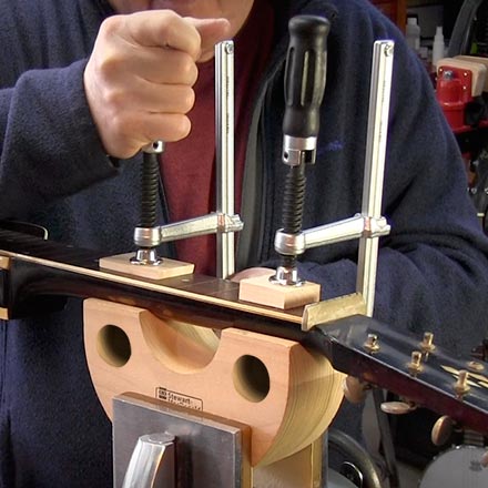 Serrez-le ! L’une des améliorations Deluxe est l’astuce de Dan Erlewine : nous avons ajouté deux trous pour serrer en toute sécurité un manche de guitare très serré pour les réparations importantes.