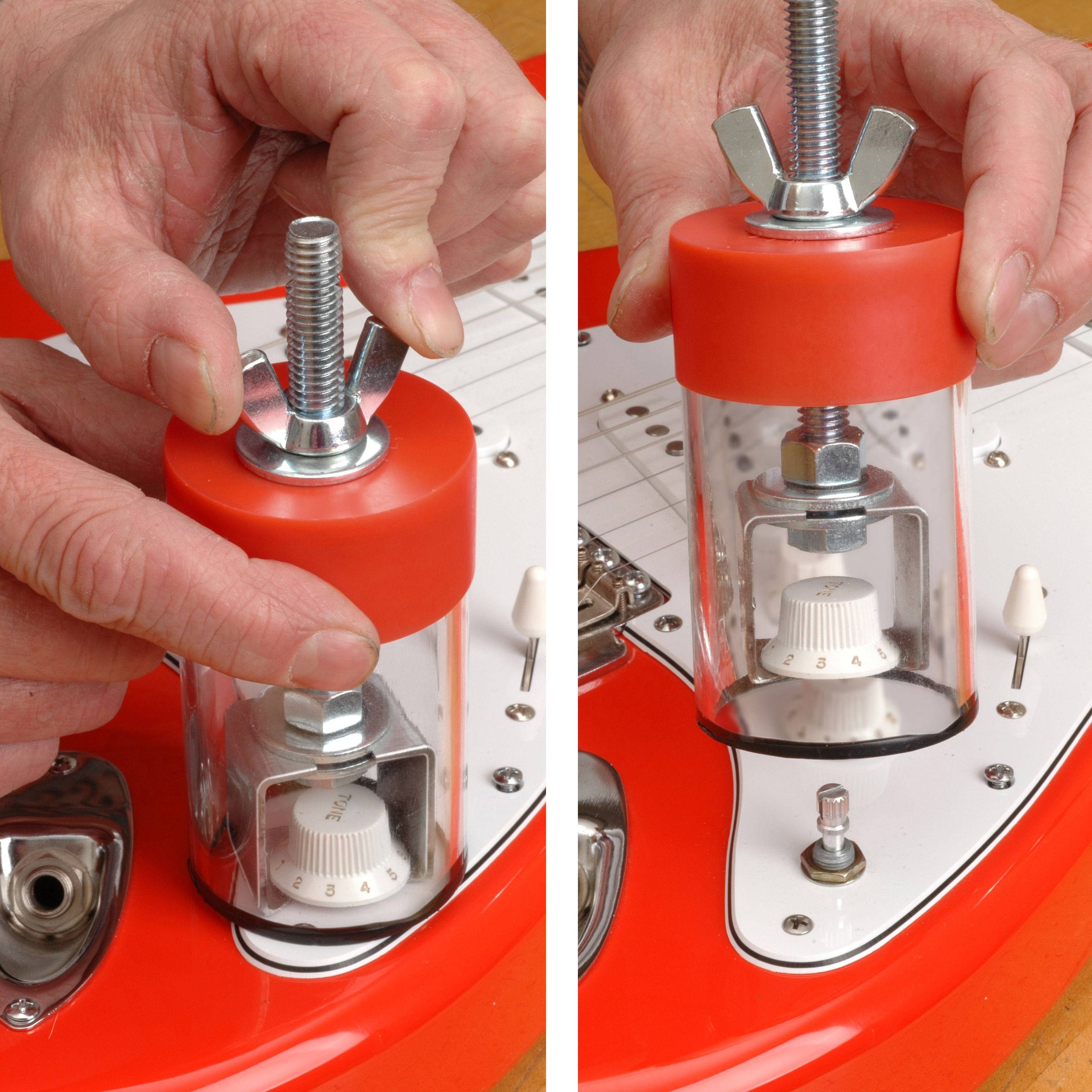 Des boutons de guitare difficiles à retirer ?Le boîtier en acrylique transparent du bouton et du tire-goupille est doté d’une base caoutchoutée pour protéger la finition de la guitare. Comprend du matériel pour extraire facilement les douilles Gibson, Schaller ou Gotoh et les goujons de la pièce d’extrémité, sans endommager la guitare.