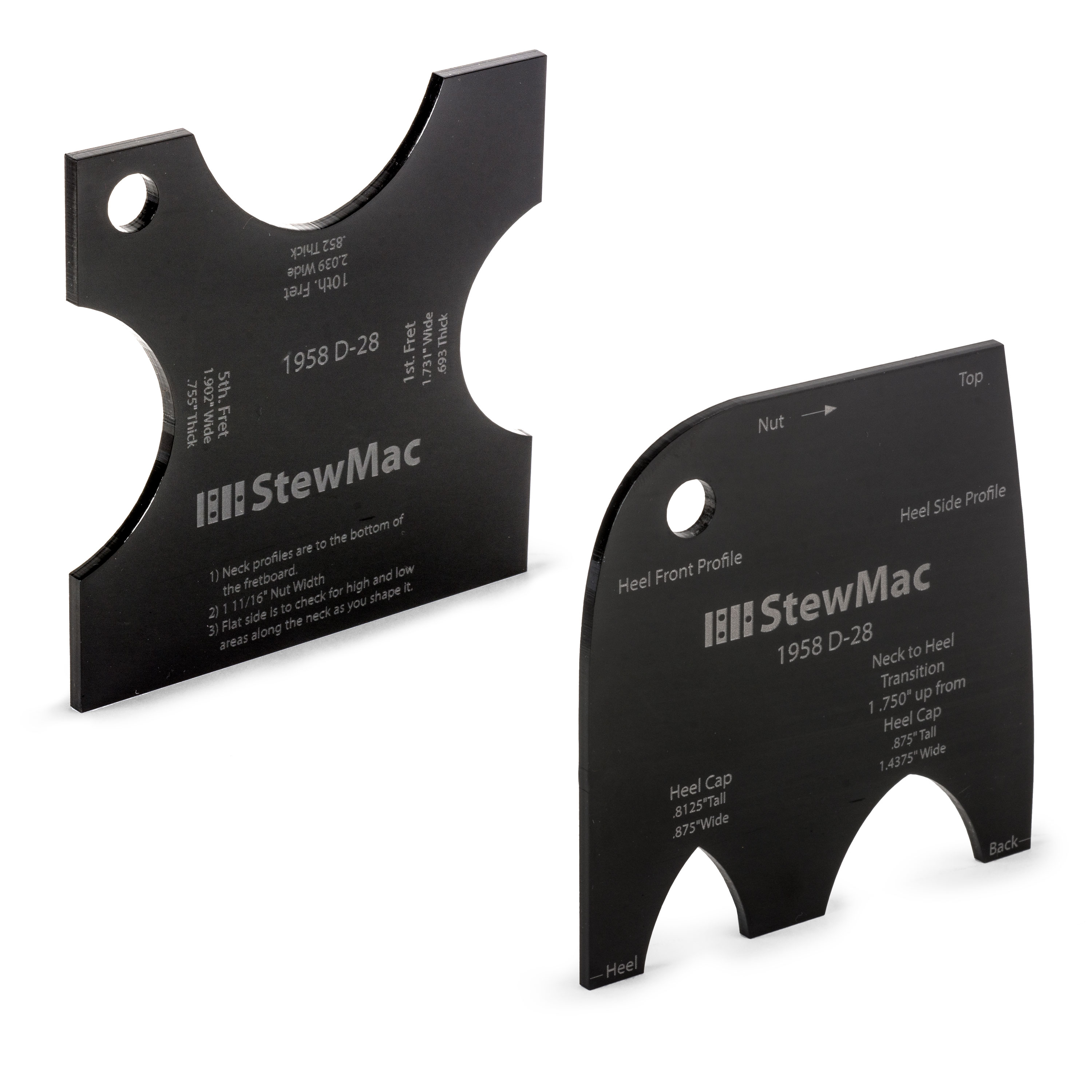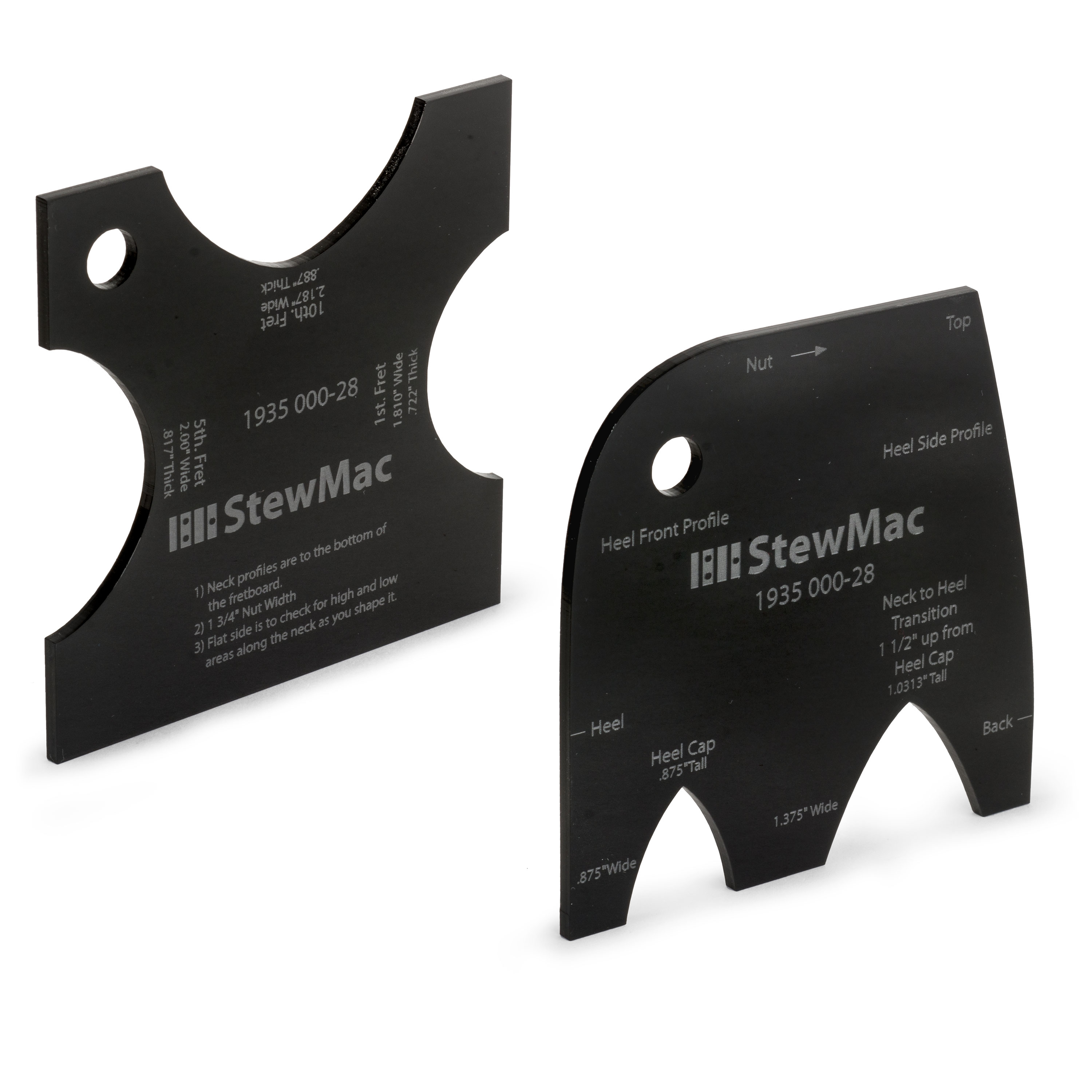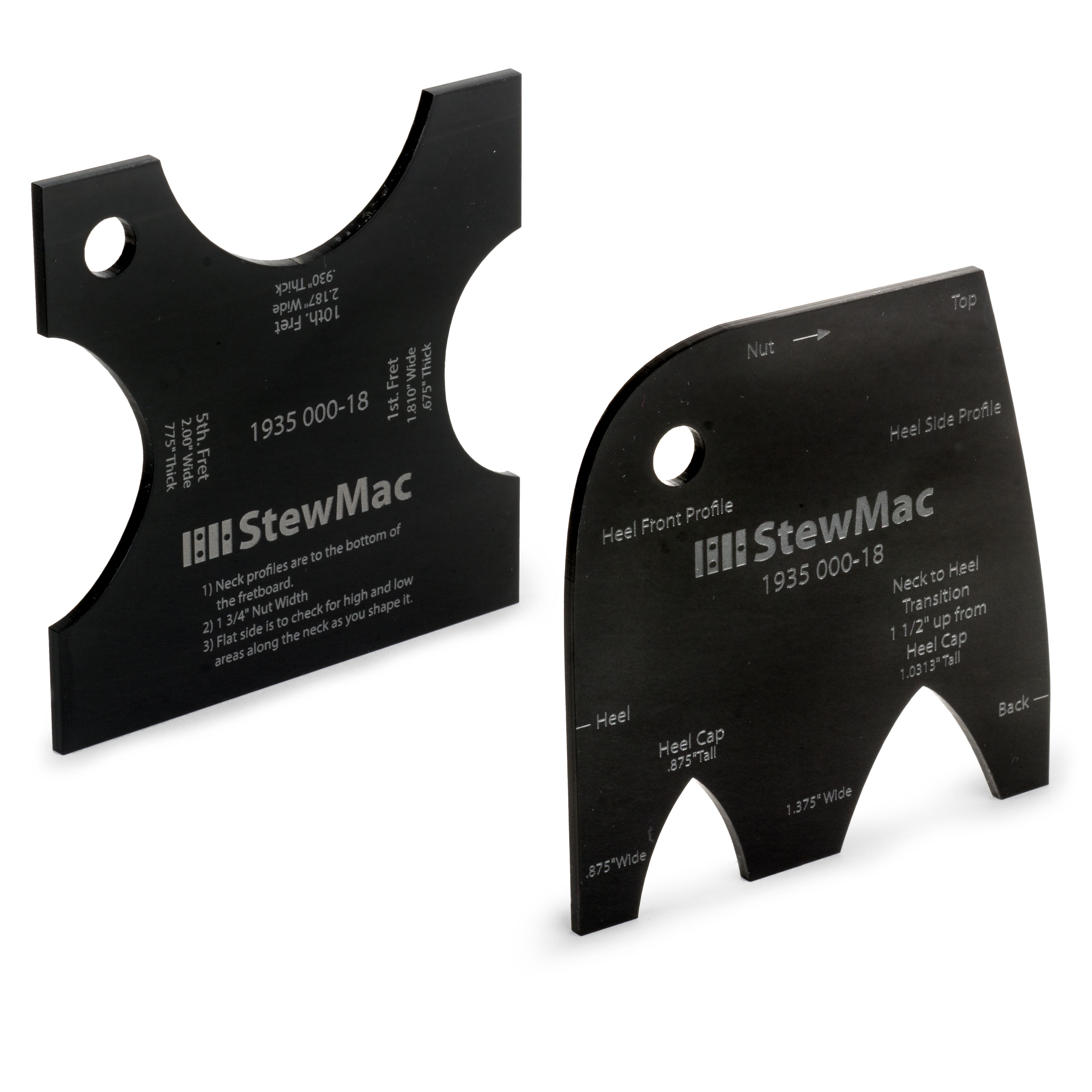Tout ce dont vous avez besoin pour réaliser des reproductions parfaites des manches. Ces nouveaux modèles présentent les contours exacts du forme du manche à partir des 1ère, 5ème et 10ème cases, et plusieurs formes de talon. Nous avons également mesuré l’épaisseur du manche à partir du bas du carton et gravé les mesures sur l’outil.