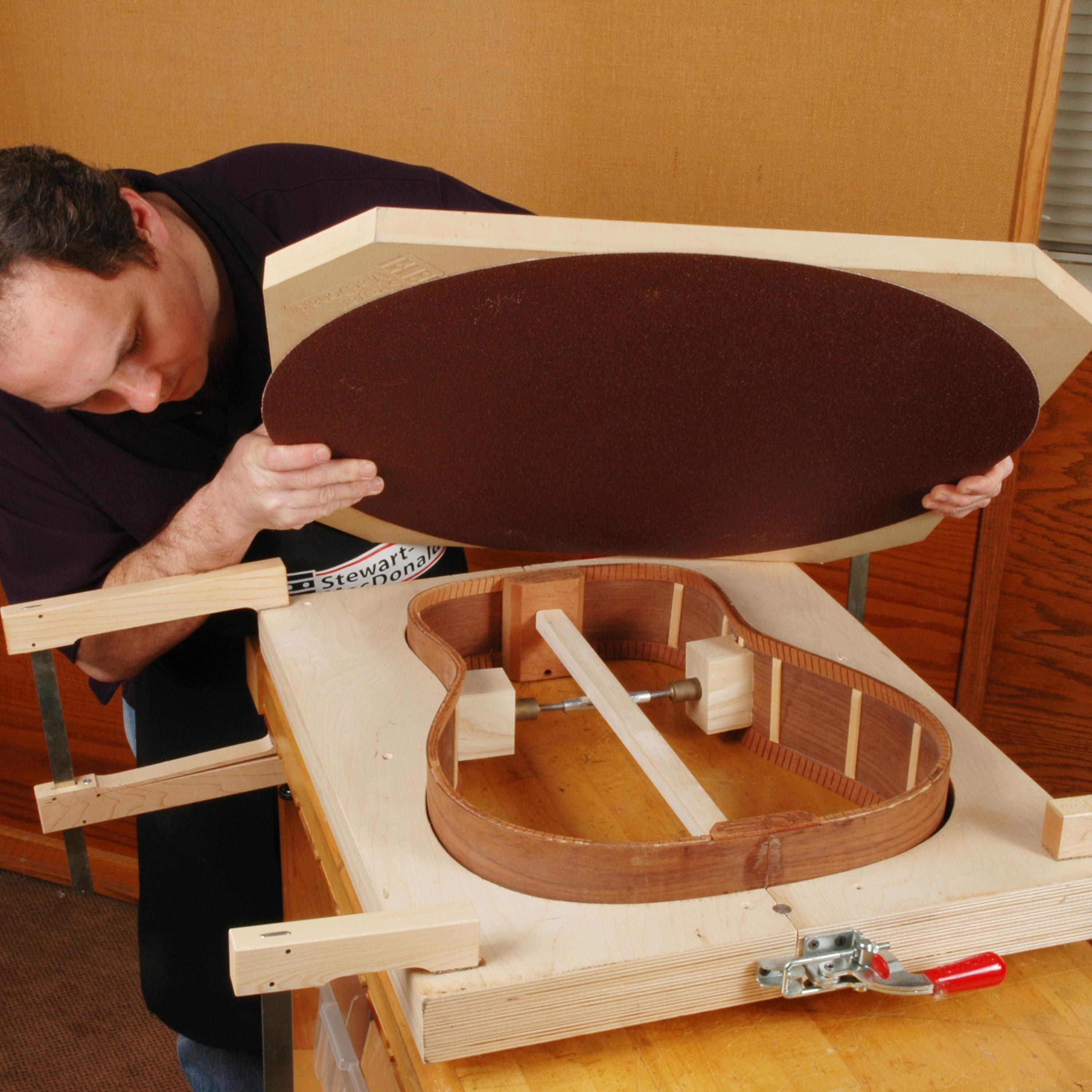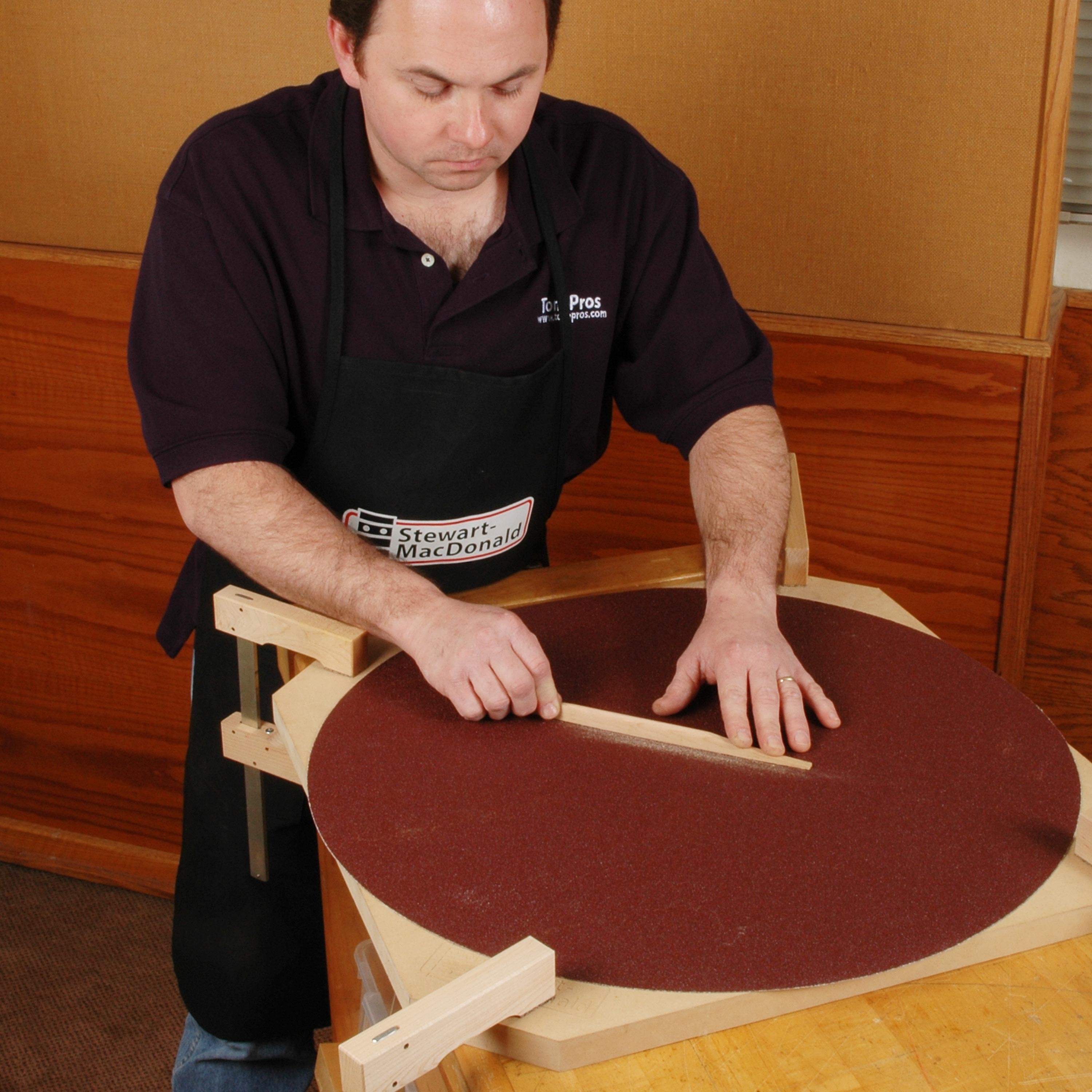 Poncer la courbure parfaite dans une renfort acoustique pour le fond : coller un disque de ponçage sur un Boîte à rayons qui correspond à votre instrument.