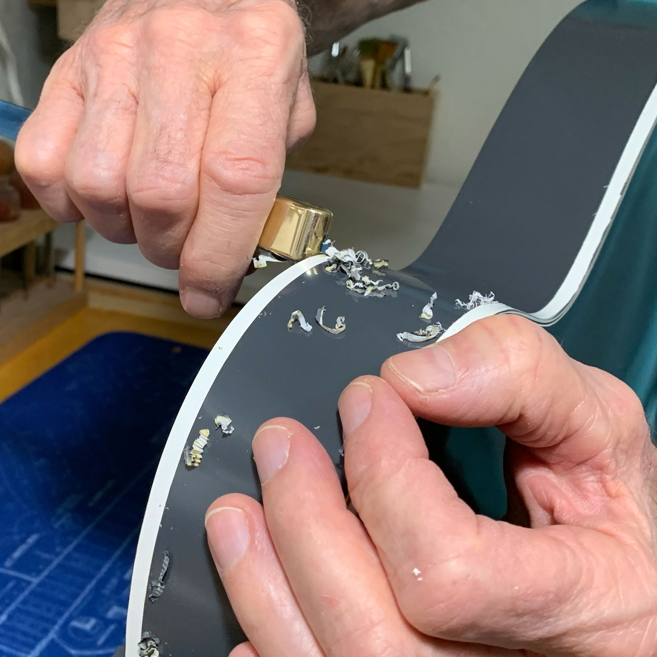 Une magnifique binding est la marque de fabrique du savoir-faire de la guitare fine. La binding grattée a des lignes nettes et épurées que la binding masquée ne peut tout simplement pas égaler. Mais il y a un problème : l’égratignure de la binding est délicate et potentiellement dangereuse ! Un petit glissement avec la lame peut signifier une terrible gouge et une réparation délicate.