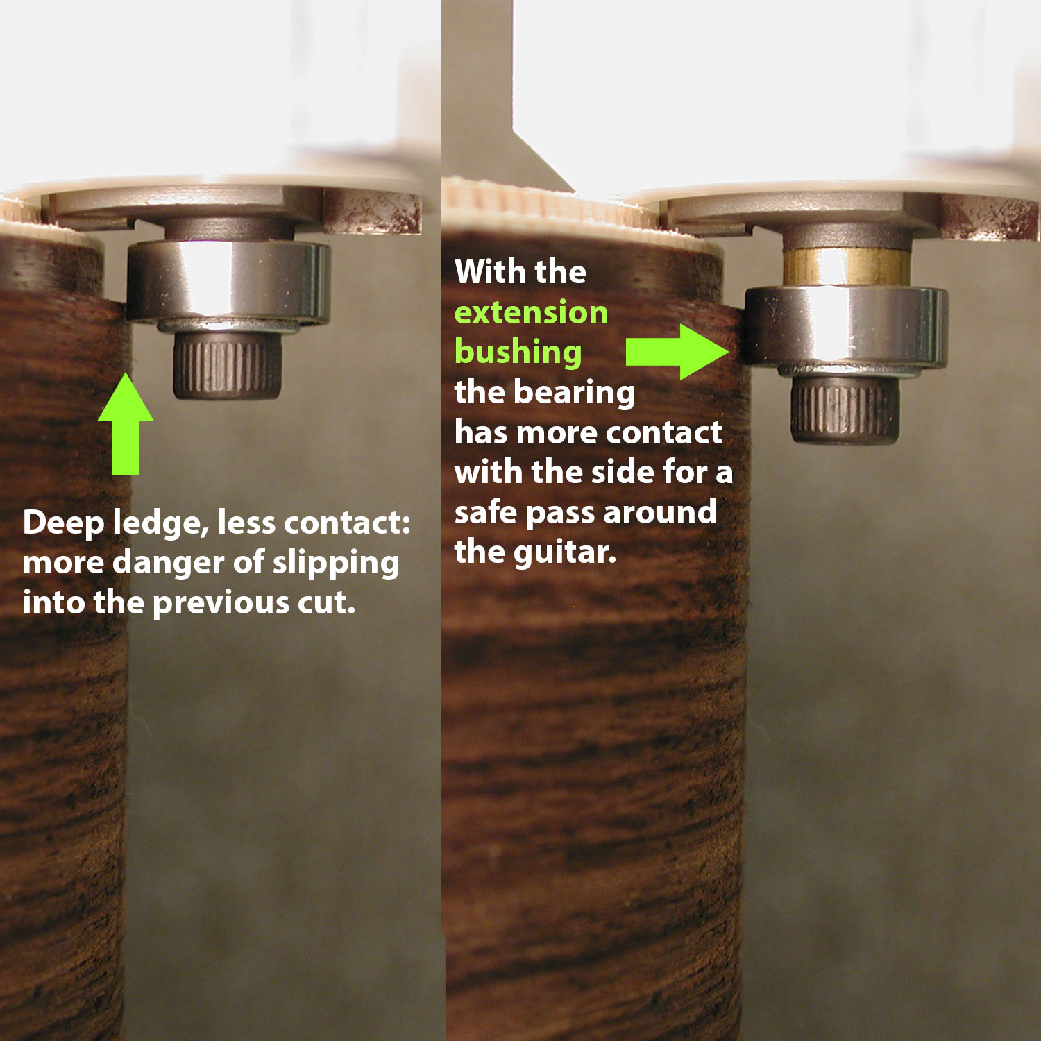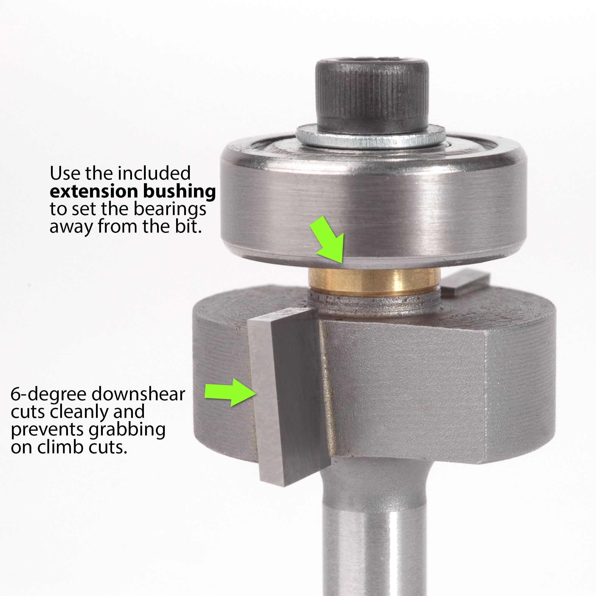 Notre trépan de routeur de binding est doté d’un arbre de 1/4 po pour s’adapter à votre routeur d’atelier. Le cisaillement descendant à 6 degrés de l’arête de coupe empêche de s’accrocher aux coupes d’ascension, pour des résultats plus nets. Le trépan est doté d'une vis Allen avec clé pour installer nos roulements de routeur de liaison. Choisissez parmi une large sélection de tailles de profondeur de coupe pour pratiquement toutes les tâches de binding . Une douille d'extension spéciale est également fournie pour l' fresado de plusieurs rebords de binding « escaliers ».