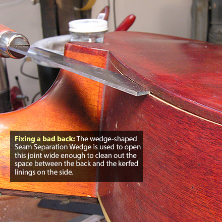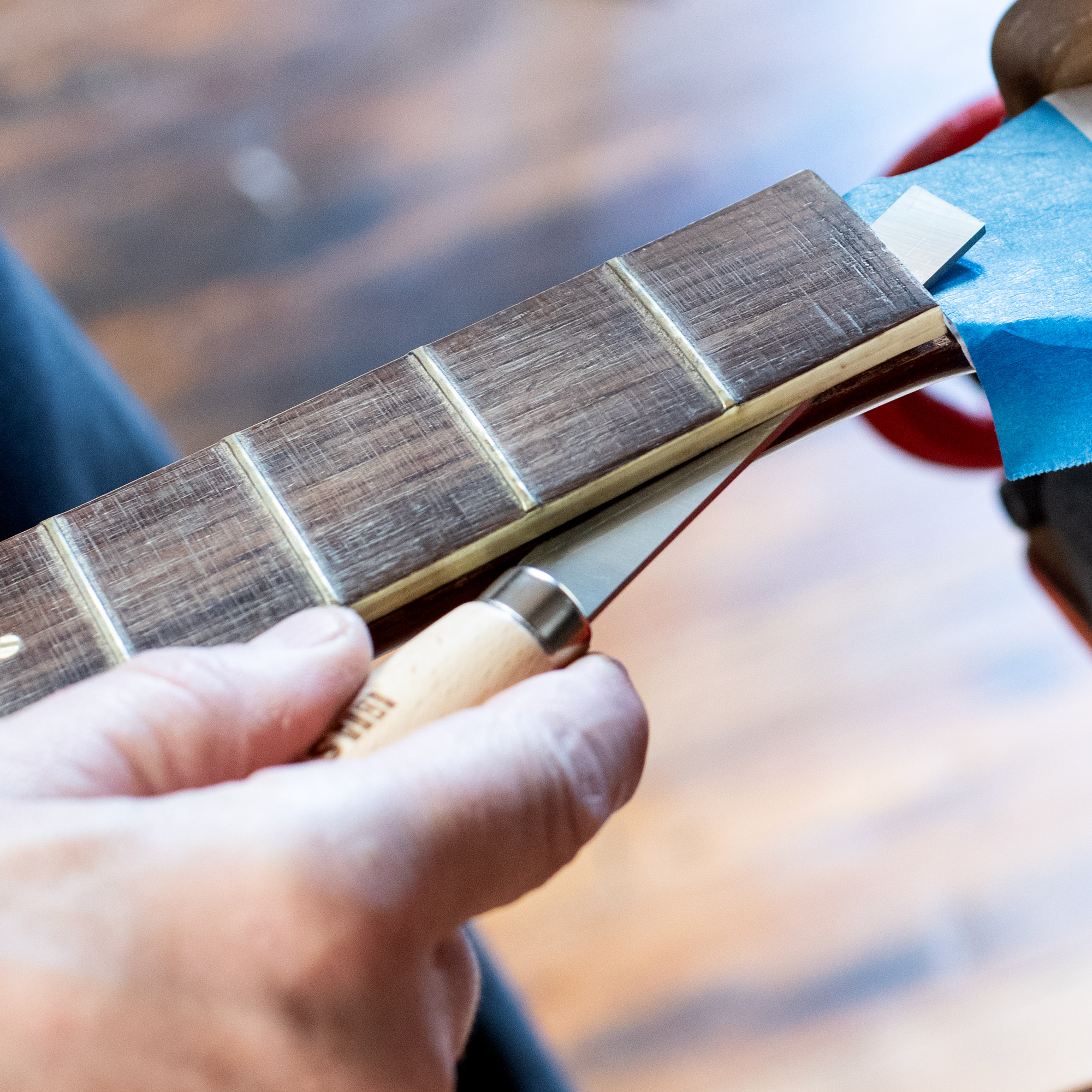 Réinventée par nos techniciens, cette lame en forme de coin ouvre en toute sécurité les joints de colle sans couper le bois. C’est l’outil idéal pour retirer les hauts, les dos et plus encore de la plupart des instruments.