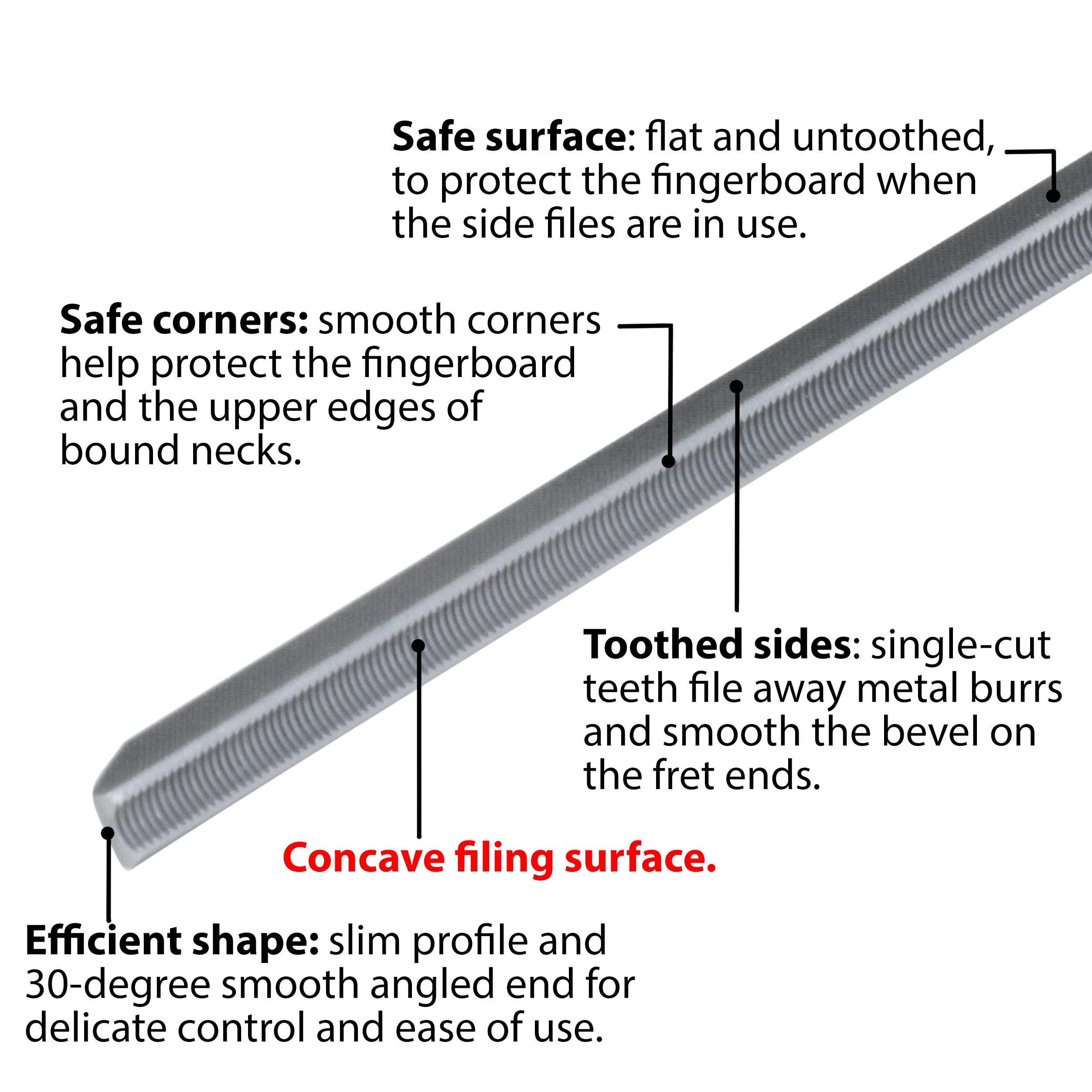 Tous nos outils peuvent également être utilisés sur du fil de frettes en acier inoxydable*. Le fil de frettes moderne en acier inoxydable est connu pour être plus dur que celui en alliage nickel-argent, mais selon notre expérience, ce fil n’use pas prématurément les limes ou le papier de verre*.