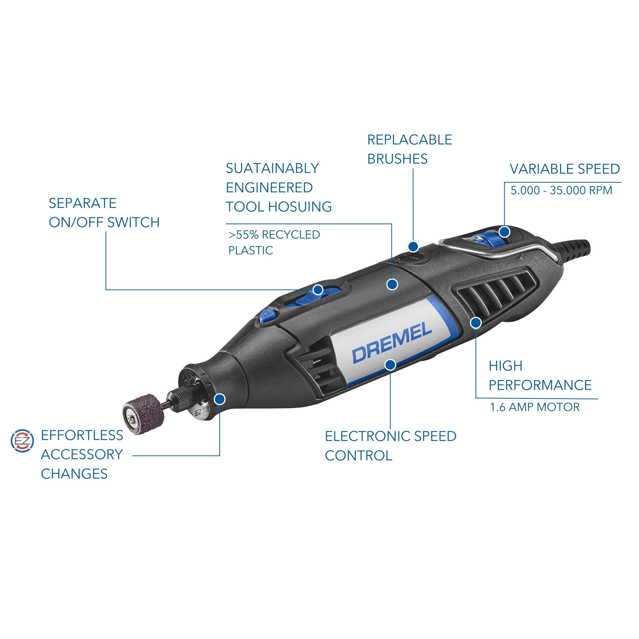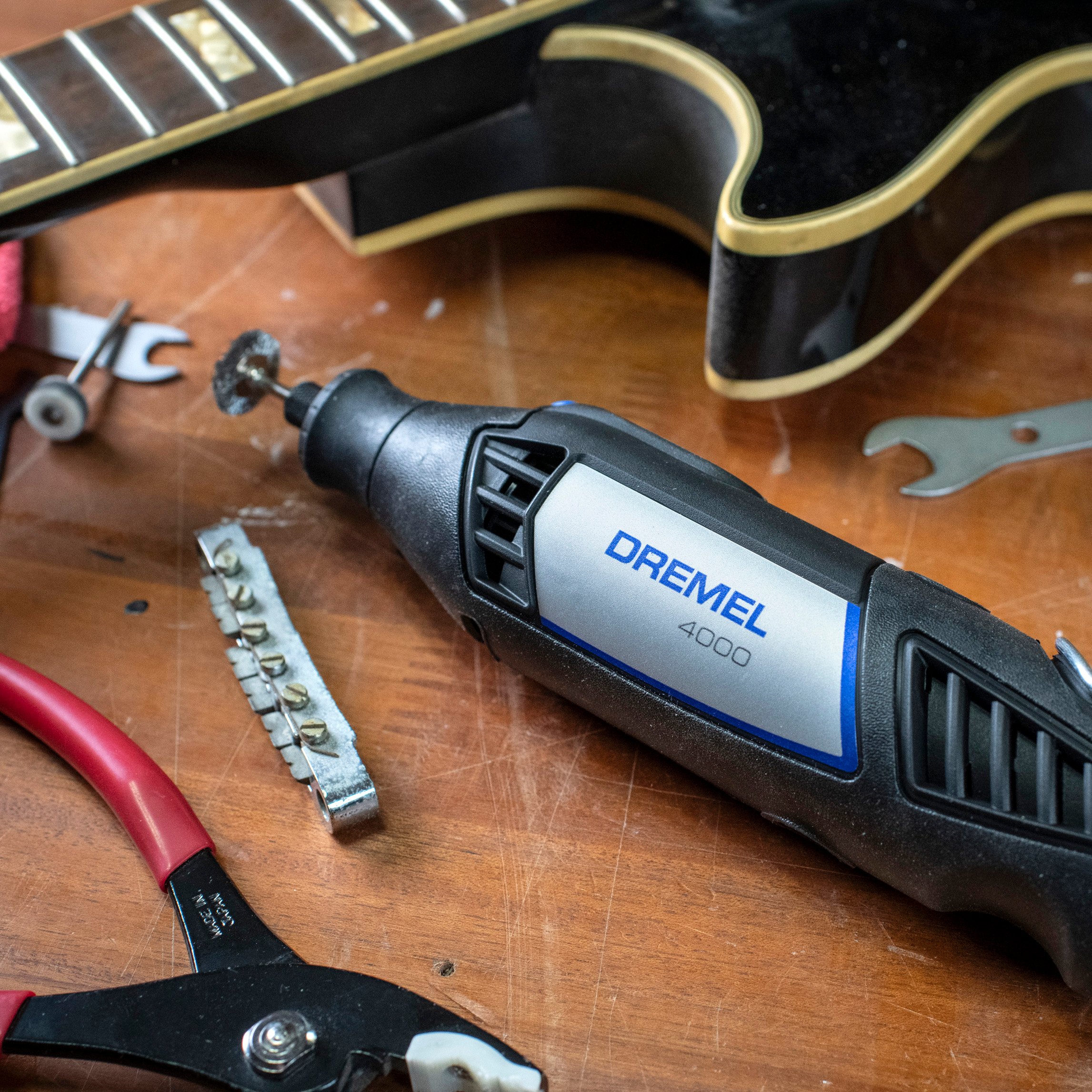 Le Dremel 4000-2/32 fait partie d’une outfit complète comprenant 30 accessoires, 2 accessoires (guide de coupe en profondeur et guide de ponçage/broyage). Confortable à tenir dans n'importe quelle position de prise, le Dremel est réglable de 5,000 à 35,000 tr/min. Tout s’insère dans un étui de rangement moulé robuste pour un transport et un accès rapides et pratiques.