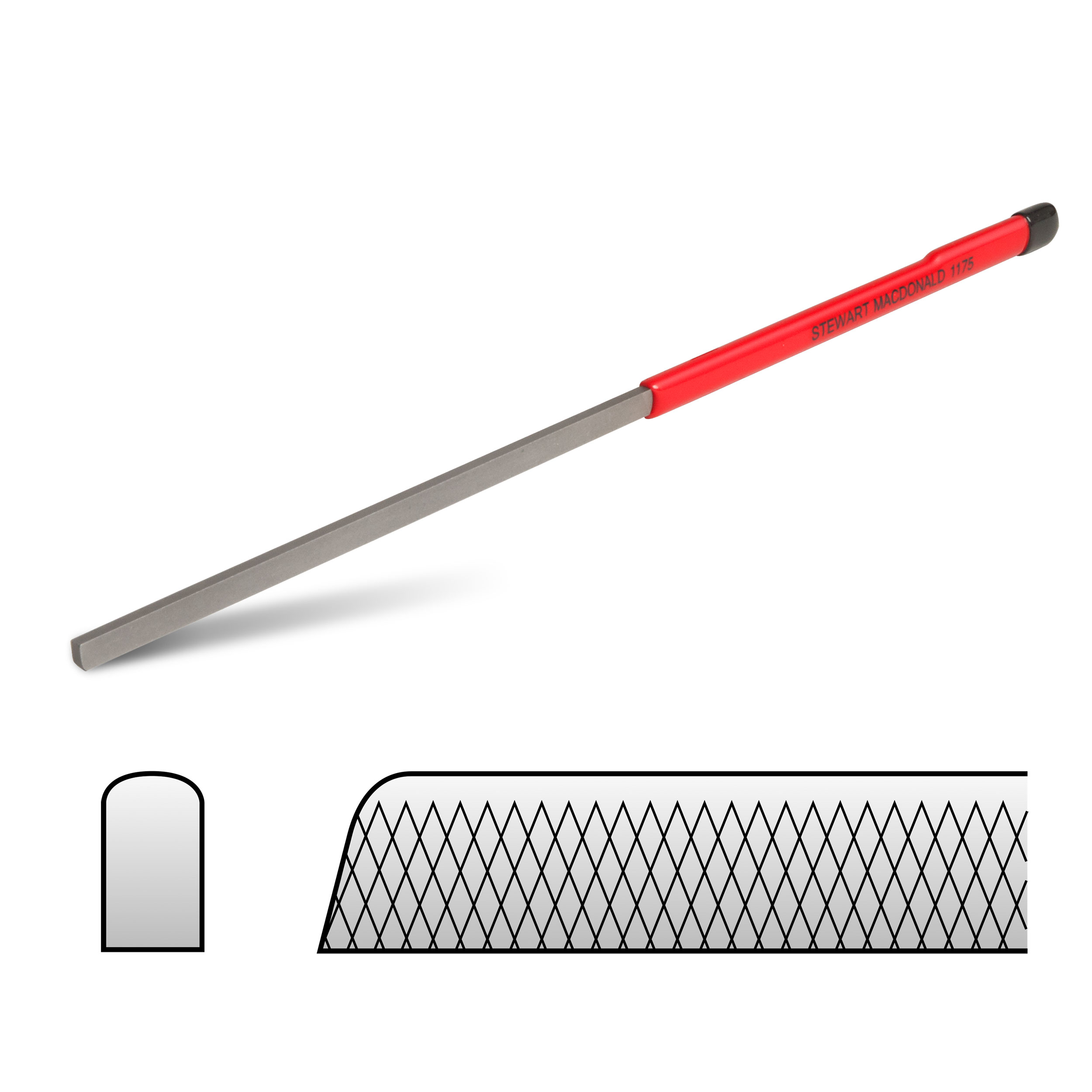 Pour arrondir, façonner et ébavurer l’extrémité des frettes.Cette lime spéciale dresse l’extrémité des frettes déjà installées, taillées à ras et biseautées.