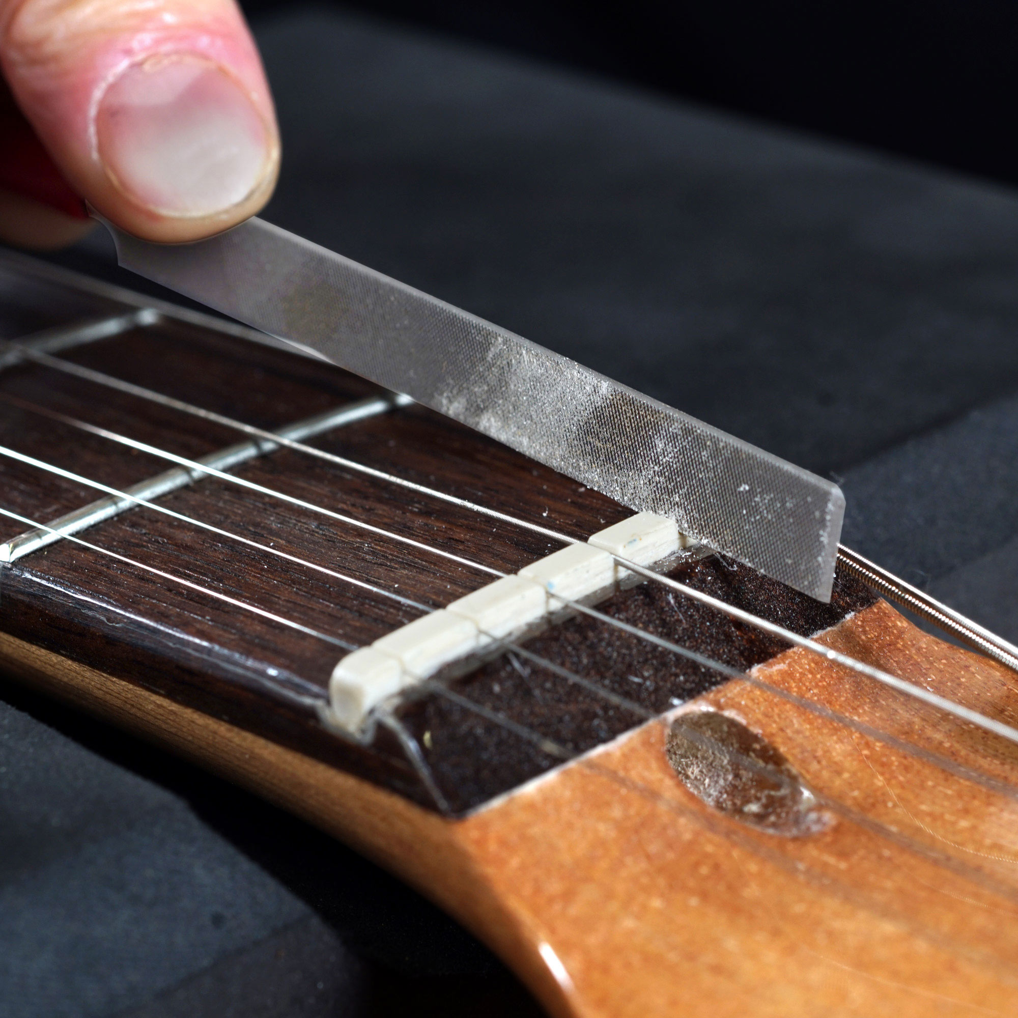 La plupart des limes vendues en quincailleries sont bien trop abrasives pour travailler sur une guitare. Cette lime possède une surface abrasive très fine et vous permet de contrôler la quantité de matière que vous enlevez, sans craindre de défigurer votre précieux instrument. Ses dimensions compactes permettent d’accéder aux espaces exigus et elle fournit une bonne prise en main pour les tâches de précision.