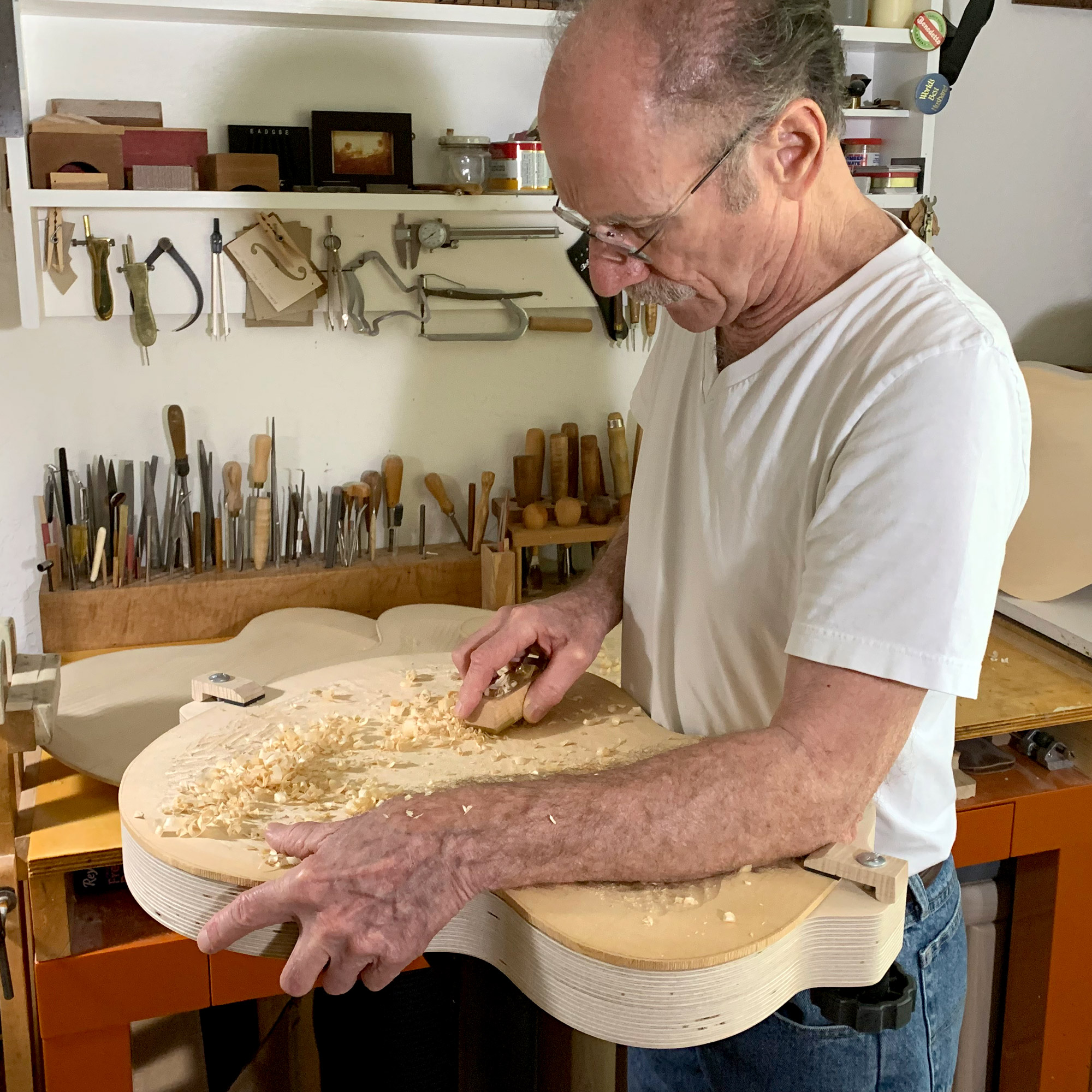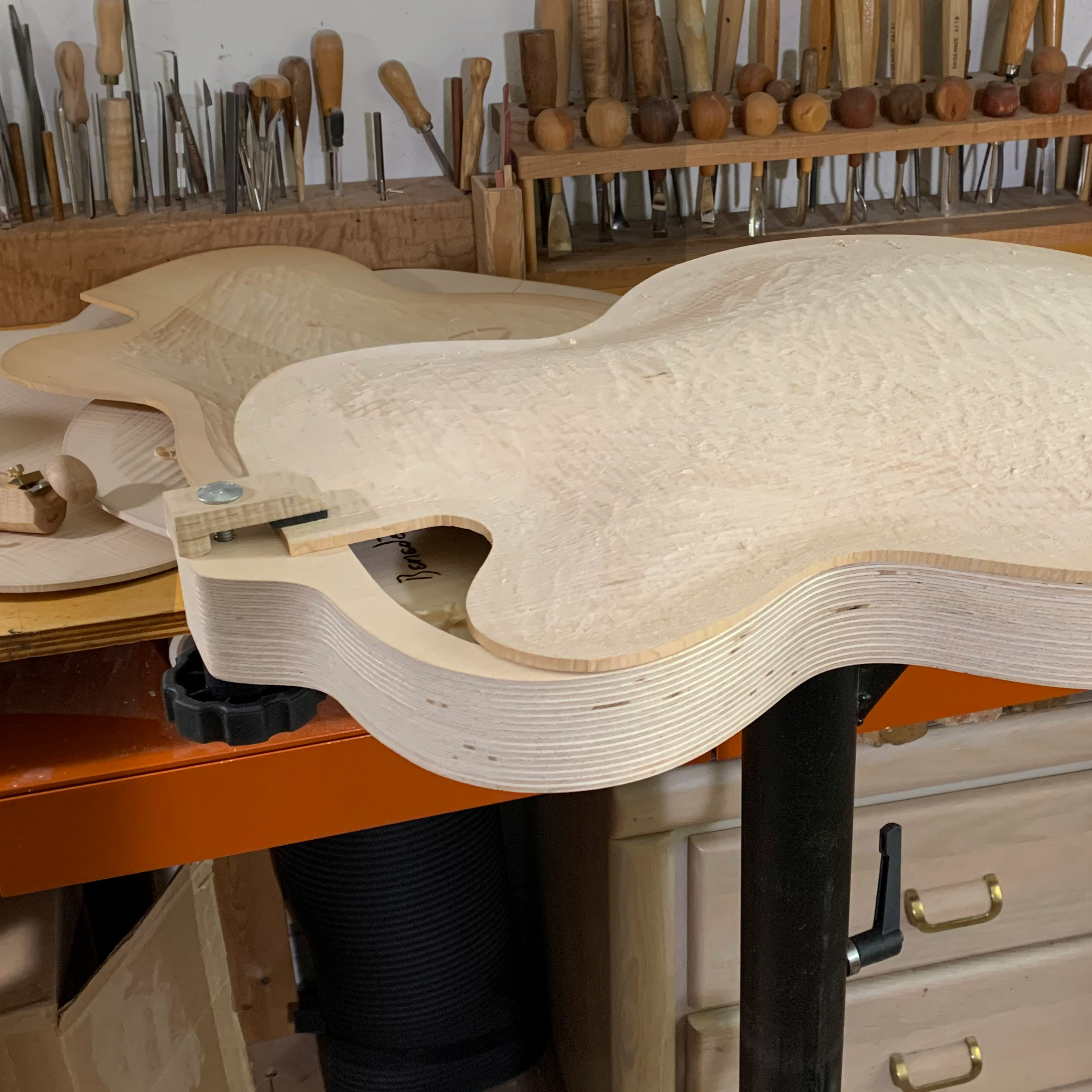 La fabrication d’une guitare à voûte plantaire n’est pas un petit exploit, et le plus difficile de loin est de découper le haut et l’arrière. Vous devez non seulement tenir les plaques fermement, mais vous devez également avoir la liberté de sculpter sous n’importe quel angle. Comme le montre son livre classique Archtop Guitar Design and Construction , Benedtto a conçu la solution parfaite pour vous donner un contrôle total sur votre conception de voûte du début à la fin.
