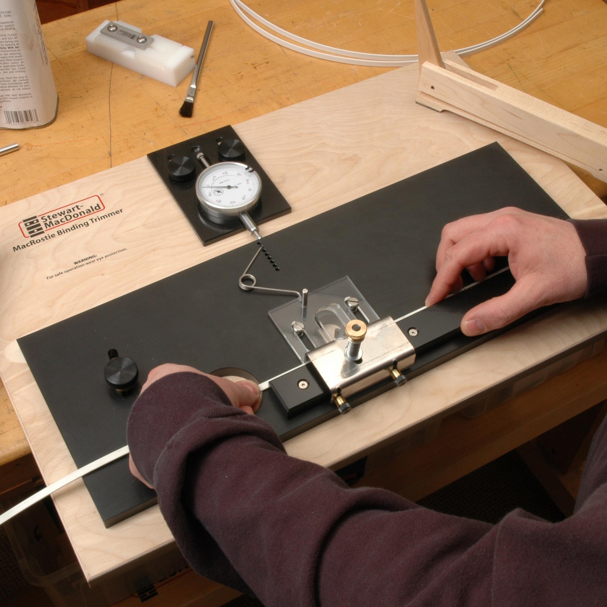 La tondeuse de fixation a été développé et affiné par Don MacRostie de Stewart-MacDonald. Les retenues de tension à ressort verticales et horizontales domptent les matériaux de binding flexibles pour la coupe jusqu’à 1/16" lorsque vous les tirez à travers le trépan. La base robuste du routeur en contreplaqué est percée pour s’adapter au Routeur Bosch Colt (vous pouvez facilement refaire une recherche pour votre propre routeur d’atelier si vous le souhaitez.) Des instructions complètes de configuration photographiées sont incluses.