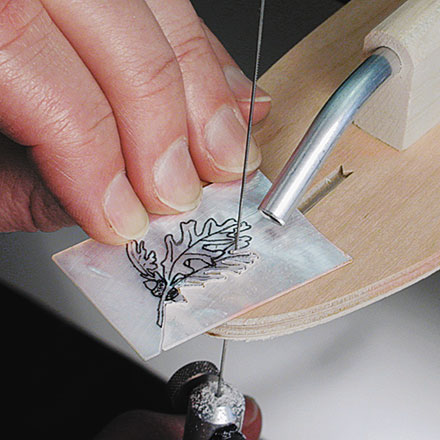 Votre motif est toujours visible pour une coupe précise. Fixez le gabarit au bord de votre paillasse, maintenez la perle à plat sur le trou du gabarit et sciez verticalement en course descendante.