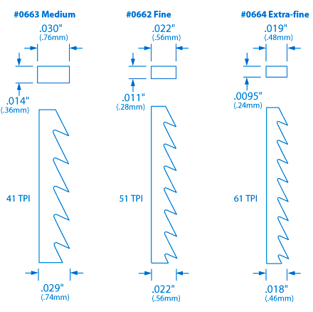 Lames : 5-3/8" de long et vendues par lot de 12. Les lames fines sont conçues pour les travaux complexes ; les lames moyennes coupent un peu plus vite. Les lames extra-fines permettent des coupes plus nettes dans l’ AbaLam.