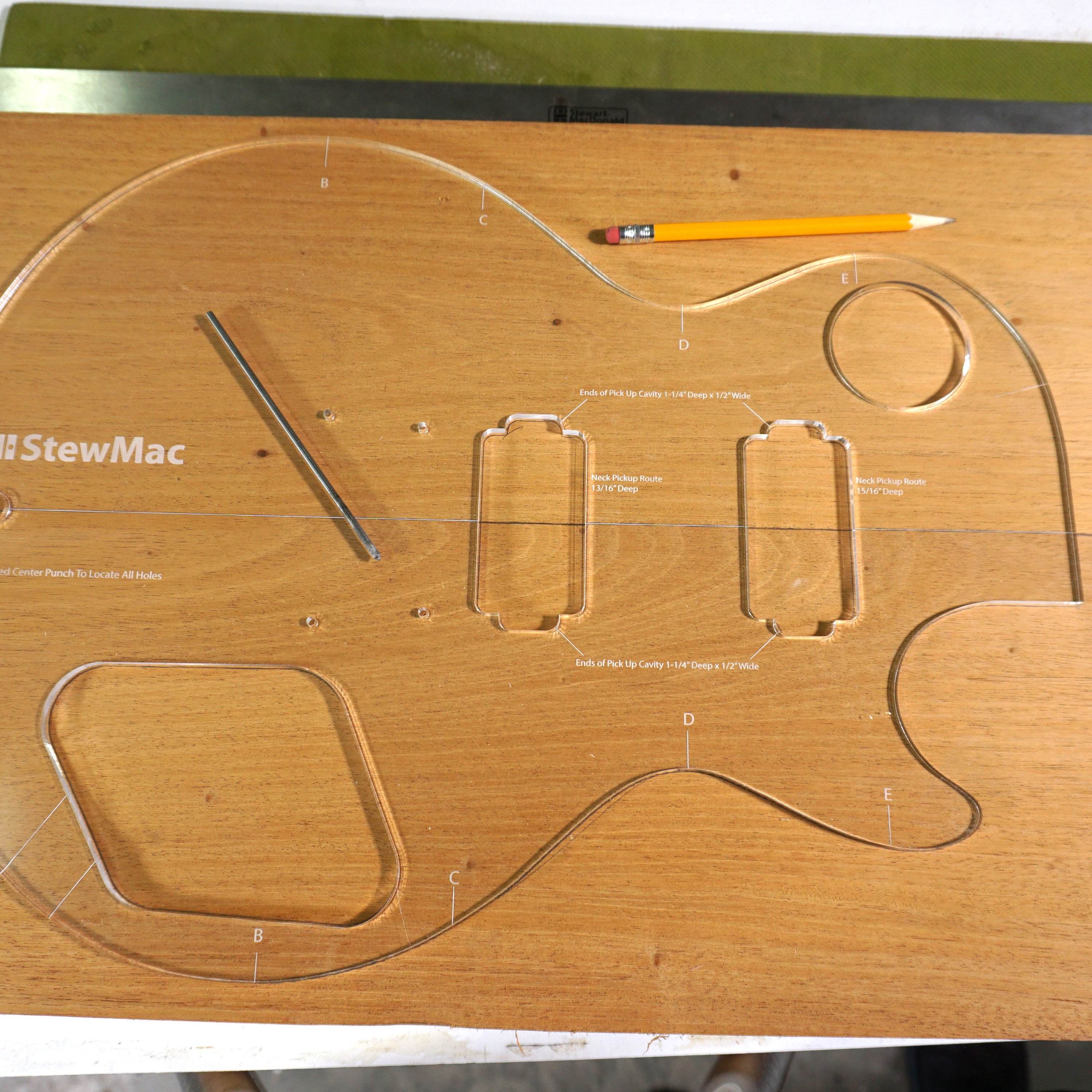 Comprend un modèle pour l'acheminement des cavités de ramassage du cou et du micro chevalet pour deux ramassages P-90. Ces mesures étaient basées sur un '56 Les Paul Goldtop.