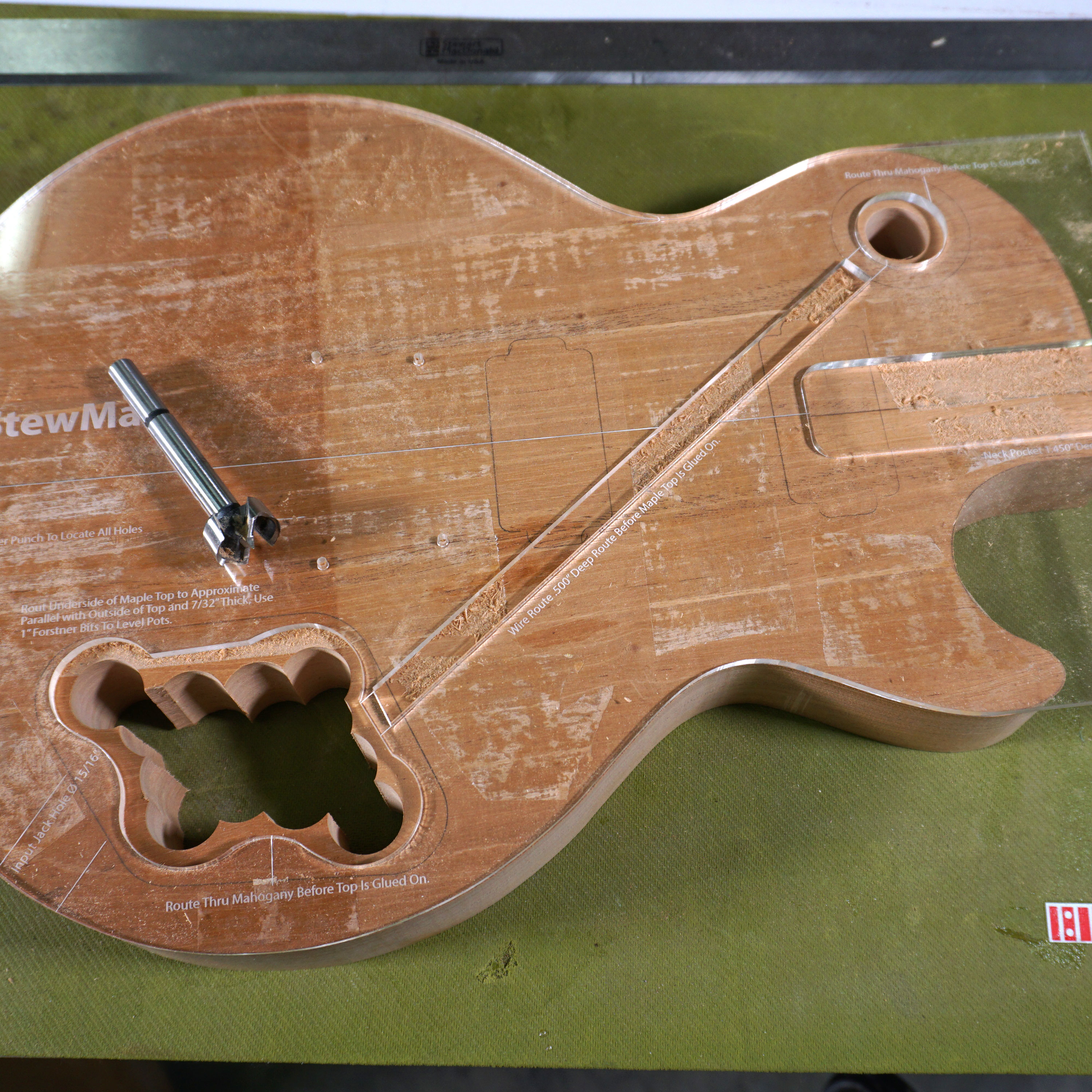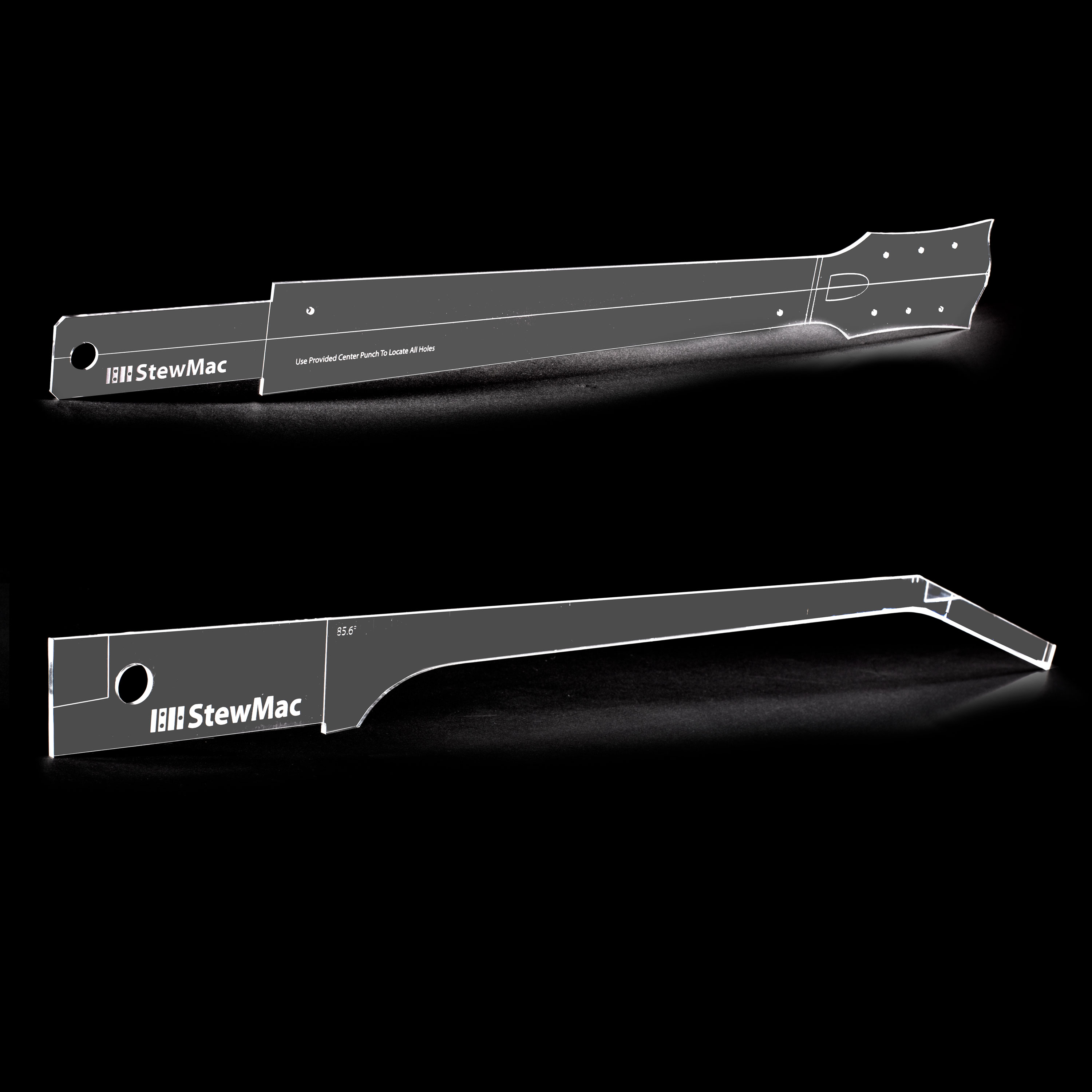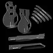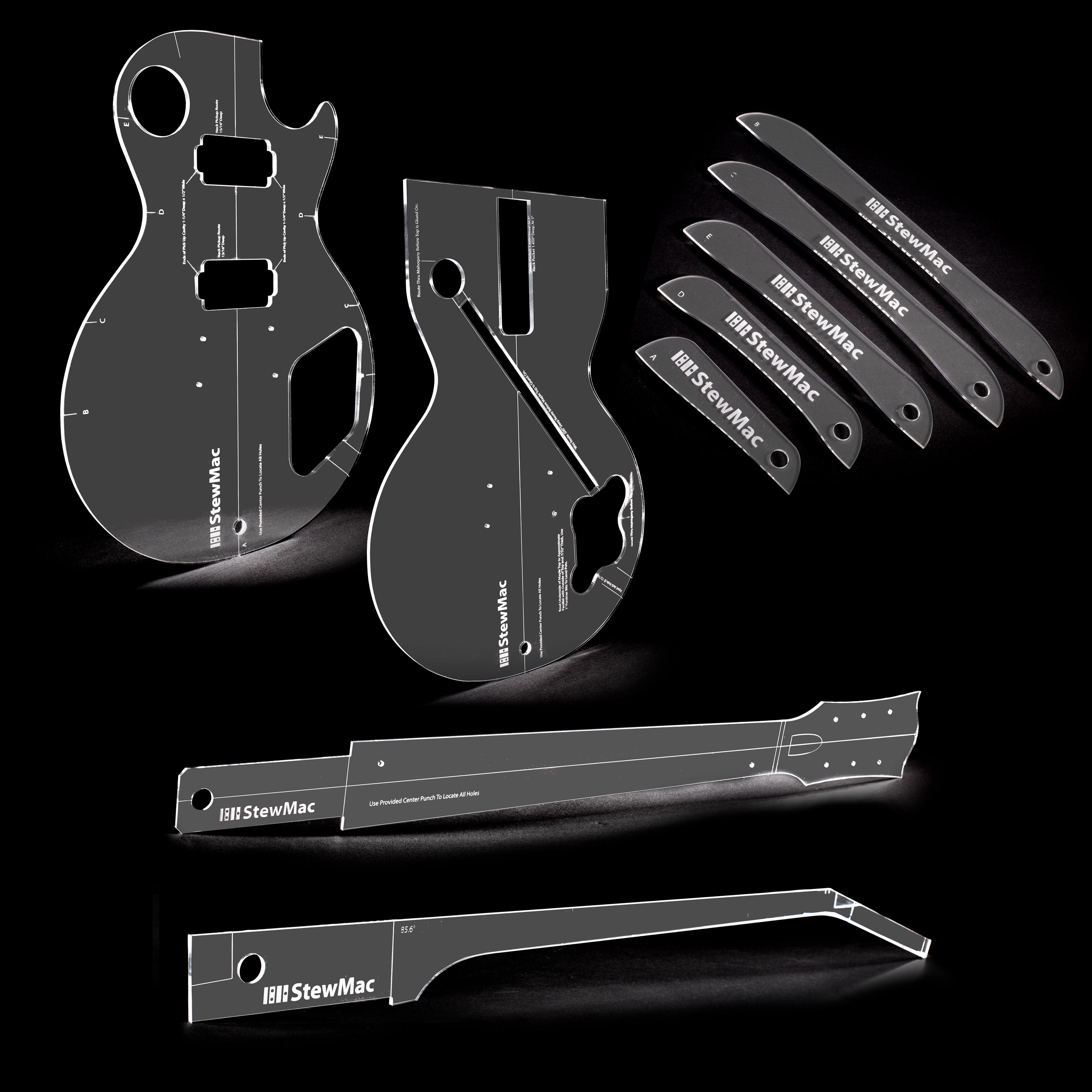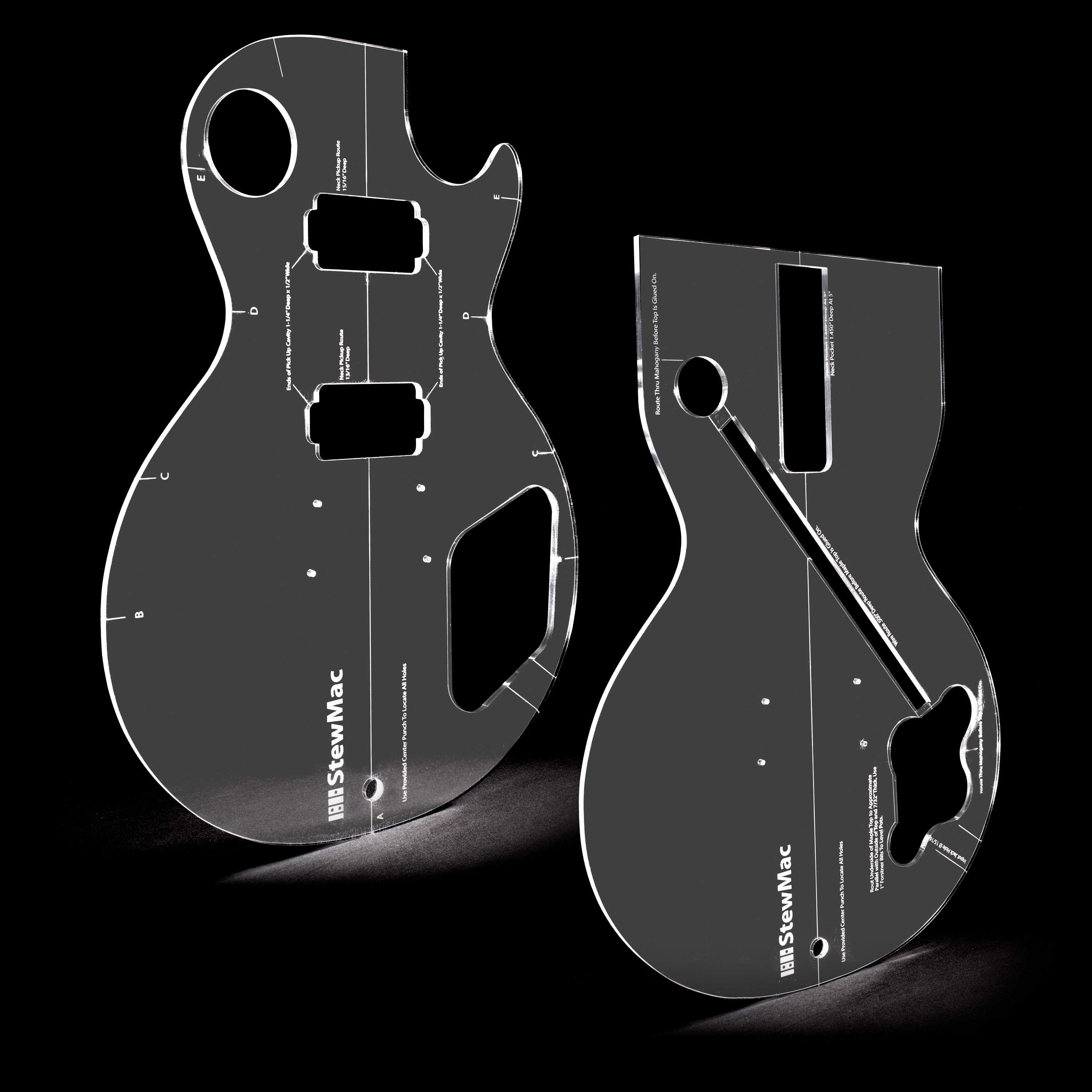 Comprend deux gabarits de taille standard avec la forme du corps, la morte du cou, les cavités de commande et de commutation (y compris les plaques de recouvrement), le canal de câblage, les cavités de ramassage du humbucker, jack et l’emplacement du pont et du poinçon