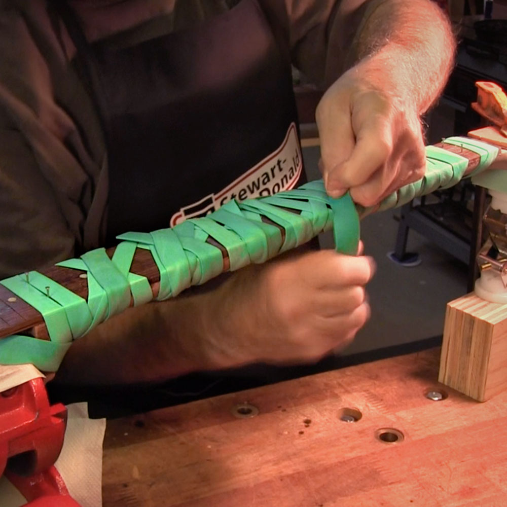 Les larges bandes sont une version plus lourde que nous aimons pour coller un touche sur un manche sans installer de pinces et de cauls encombrants. En tirant de manière égale des deux côtés, ils aident à centrer le touche sur le manche. Enveloppez-les aussi fermement que nécessaire ; ces bandes sont très résistantes. Une seule bande suffit pour coller un touche au manche.