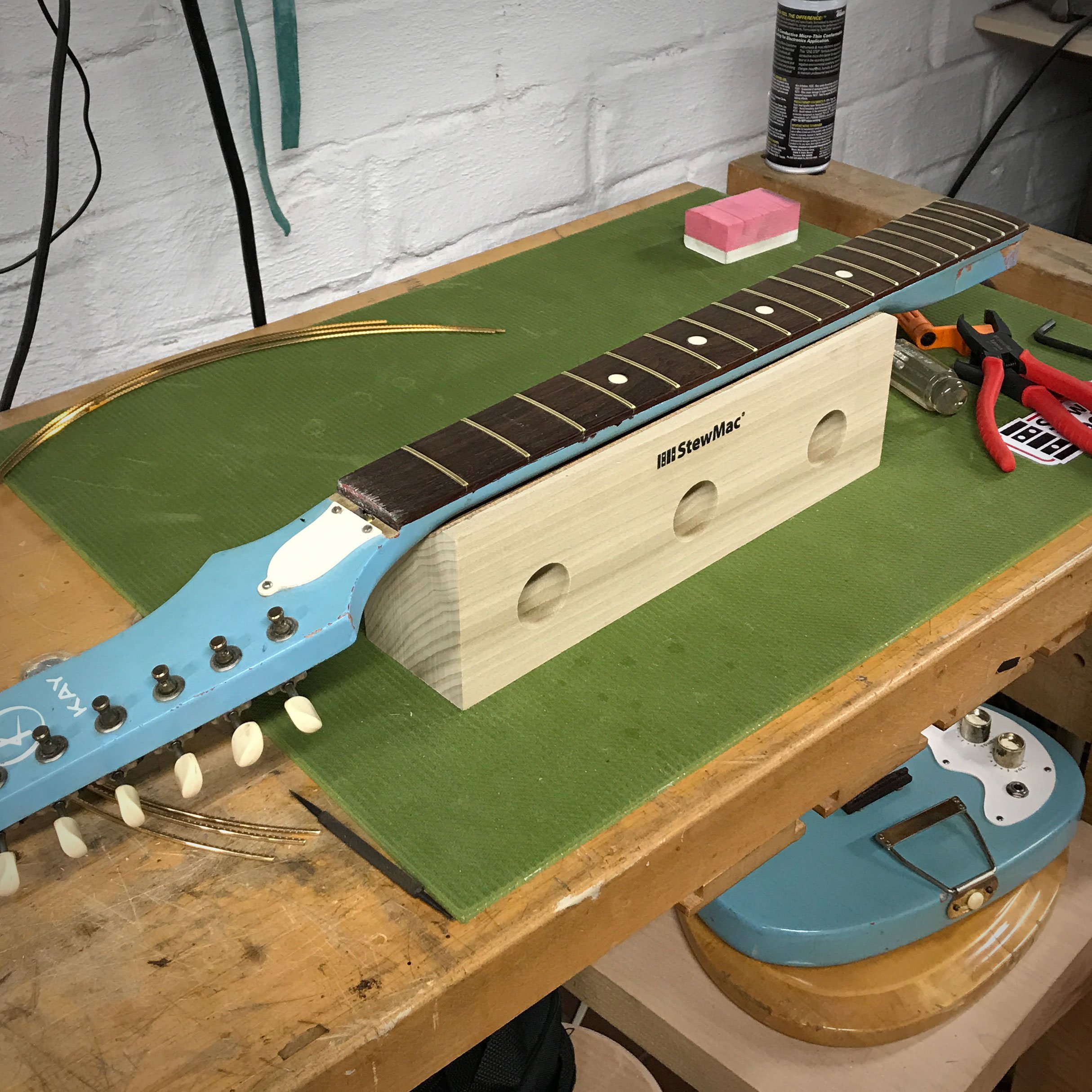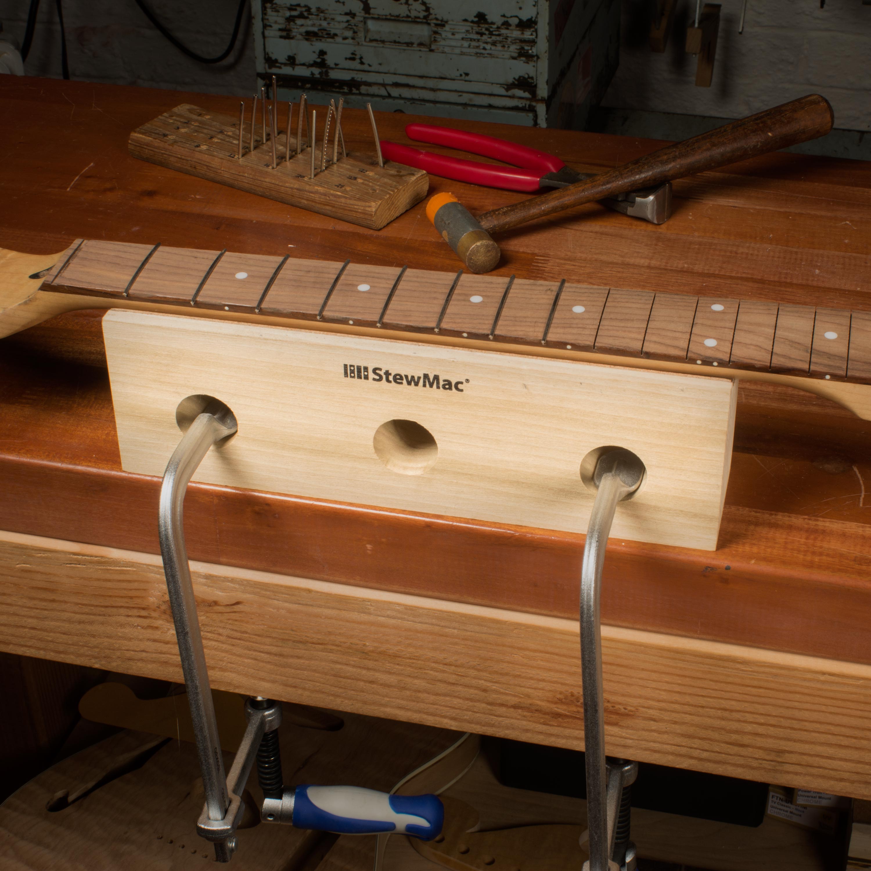Le cache- manche offre un excellent soutien sous le manche de votre guitare tout en pressant ou en martelant des frettes. Il fonctionne également bien comme un caul de serrage inférieur lors du recollage d’un touche.