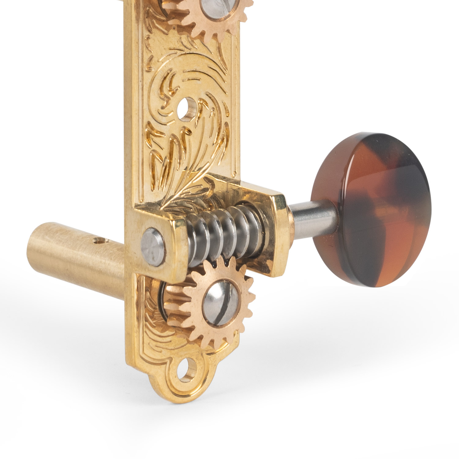Pour une précision de réglage maximale, nos 16:1 machines à plaques de précision sont dotées des mêmes engrenages et des douilles à vis sans fin filetées brevetées que celles de tous les Waverly. Les tiges en laiton sont montées sur des plaques de base en laiton poli pour une élégance et un style authentiques.