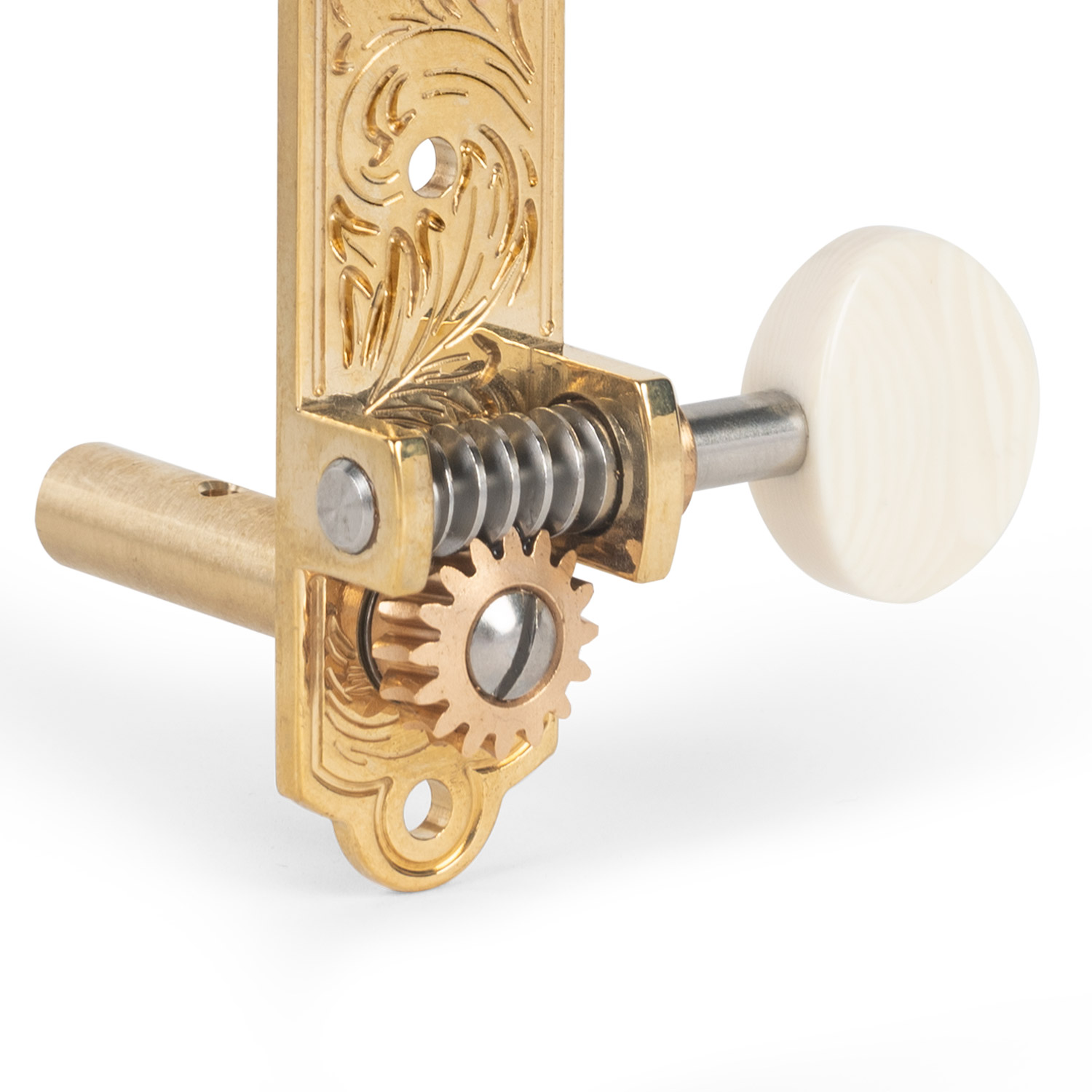 Pour une précision de réglage maximale, nos 16:1 machines à plaques de précision sont dotées des mêmes engrenages et des douilles à vis sans fin filetées brevetées que celles de tous les Waverly. Les tiges en laiton sont montées sur des plaques de base en laiton poli pour une élégance et un style authentiques.